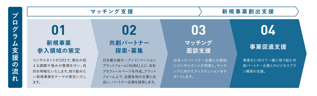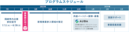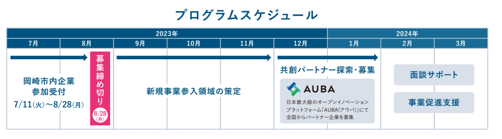 初めて新規事業をチャレンジされる市内のものづくり企業の方が、共創を希望するテーマや自社の強み・課題の整理・明確化から共創で取り組む事業領域の設定、AUBAのシステムを活用した共創パートナー募集など、eiiconが伴走支援しながら、共創実現を目指す岡崎市主催プログラムです。