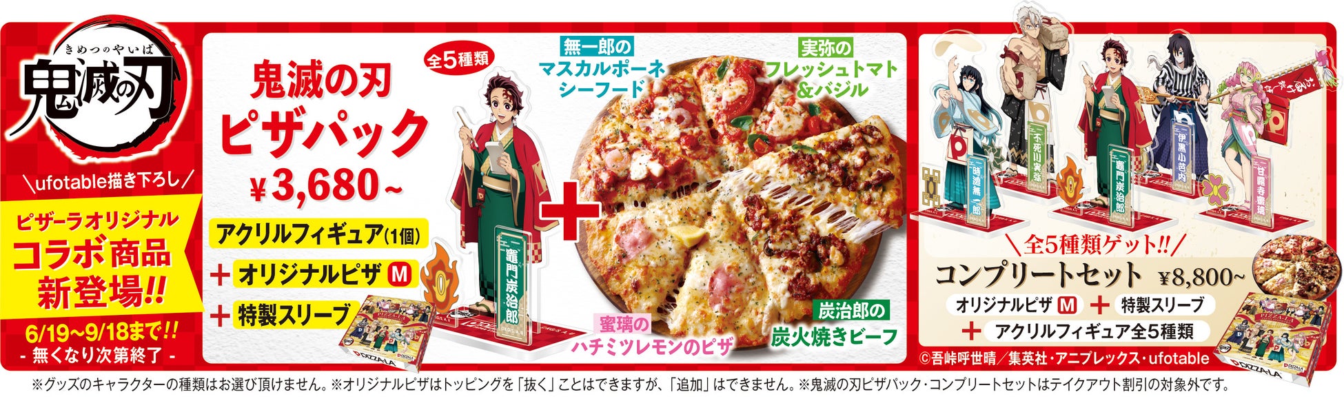 <ピザーラ×鬼滅の刃>オリジナルグッズ付きの新商品!! コラボピザ + アクスタ + ピザスリーブ = 『鬼滅の刃 ピザパック』!! コンプリートセットも同時発売!!電話・店頭での予約受付開始!!
