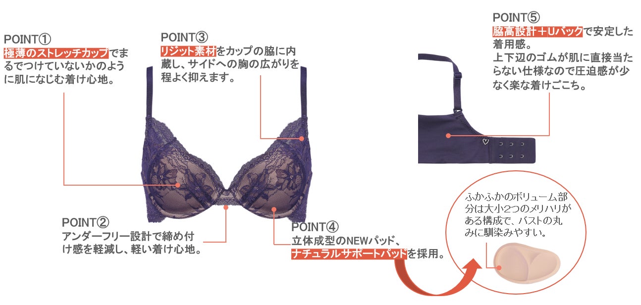 極薄のストレッチカップで肌にとけこむような着けごこちを実現しながら、中心部がふかふかで自然にバストの丸みになじむ立体成型の新パッド「ナチュラルサポートパッド」や脇高仕様で安定した着用感。カップ脇に内蔵したリジット素材がサイドへの胸の広がりをホールド。丸みのあるナチュラルなバストシルエットを叶えます。