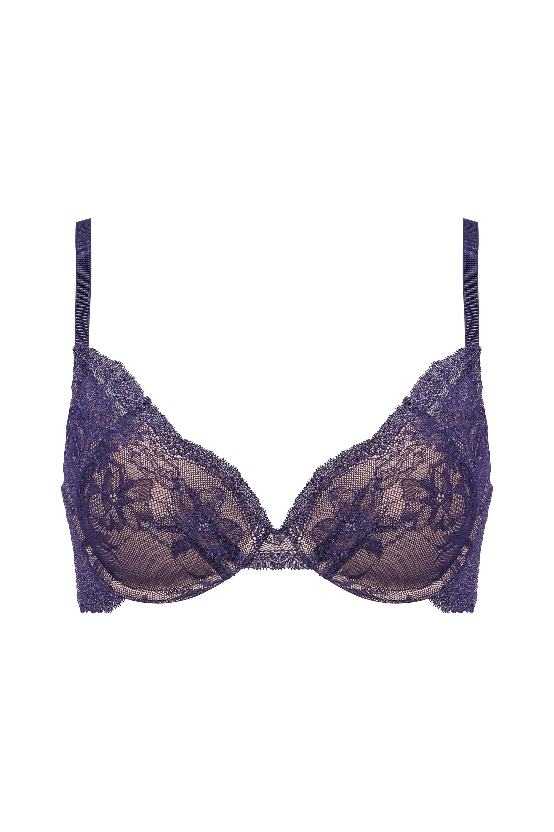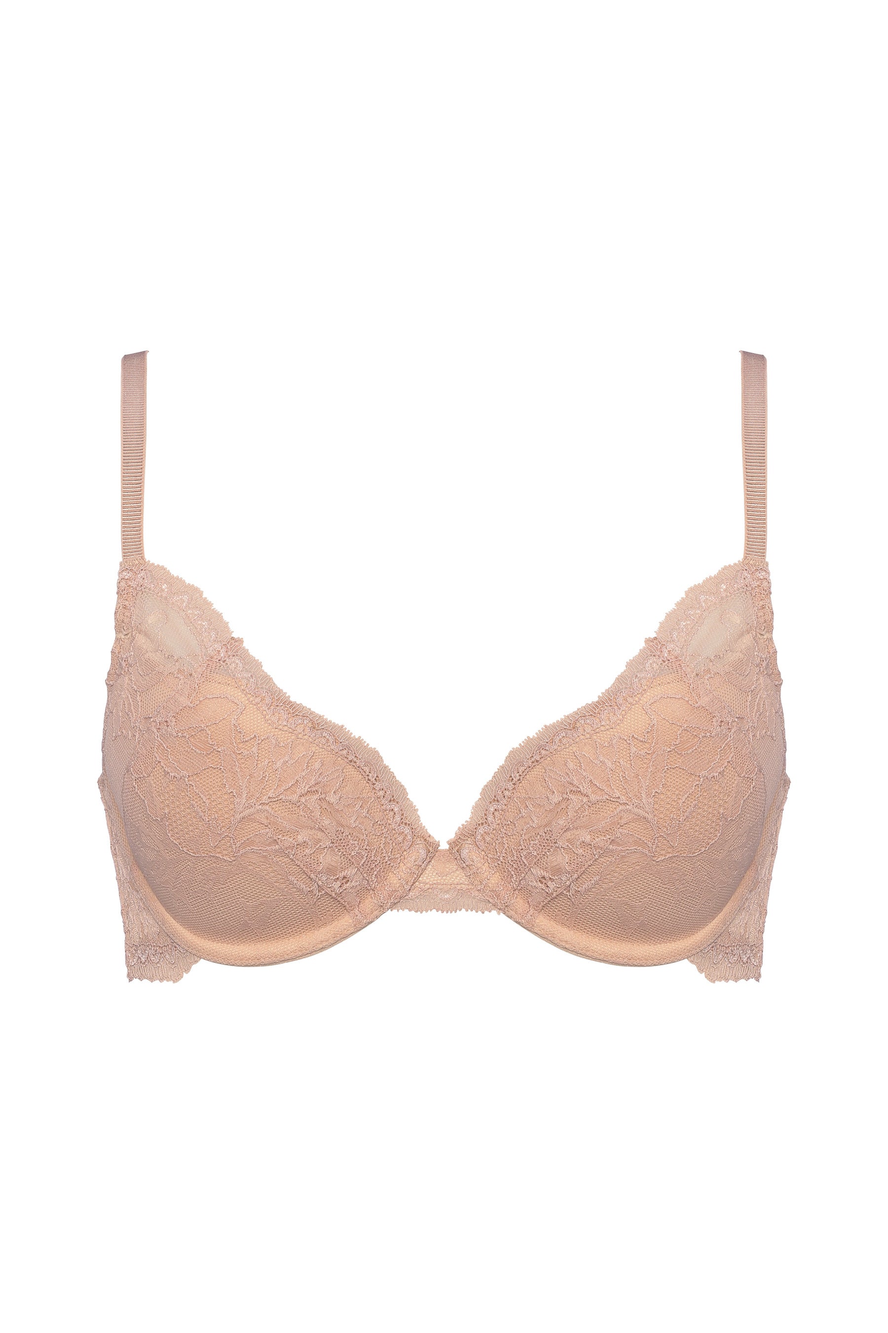 ヌーディーカラーのカップがレースの柄を引き立たせ、繊細でインポートライクな印象に仕上げました。