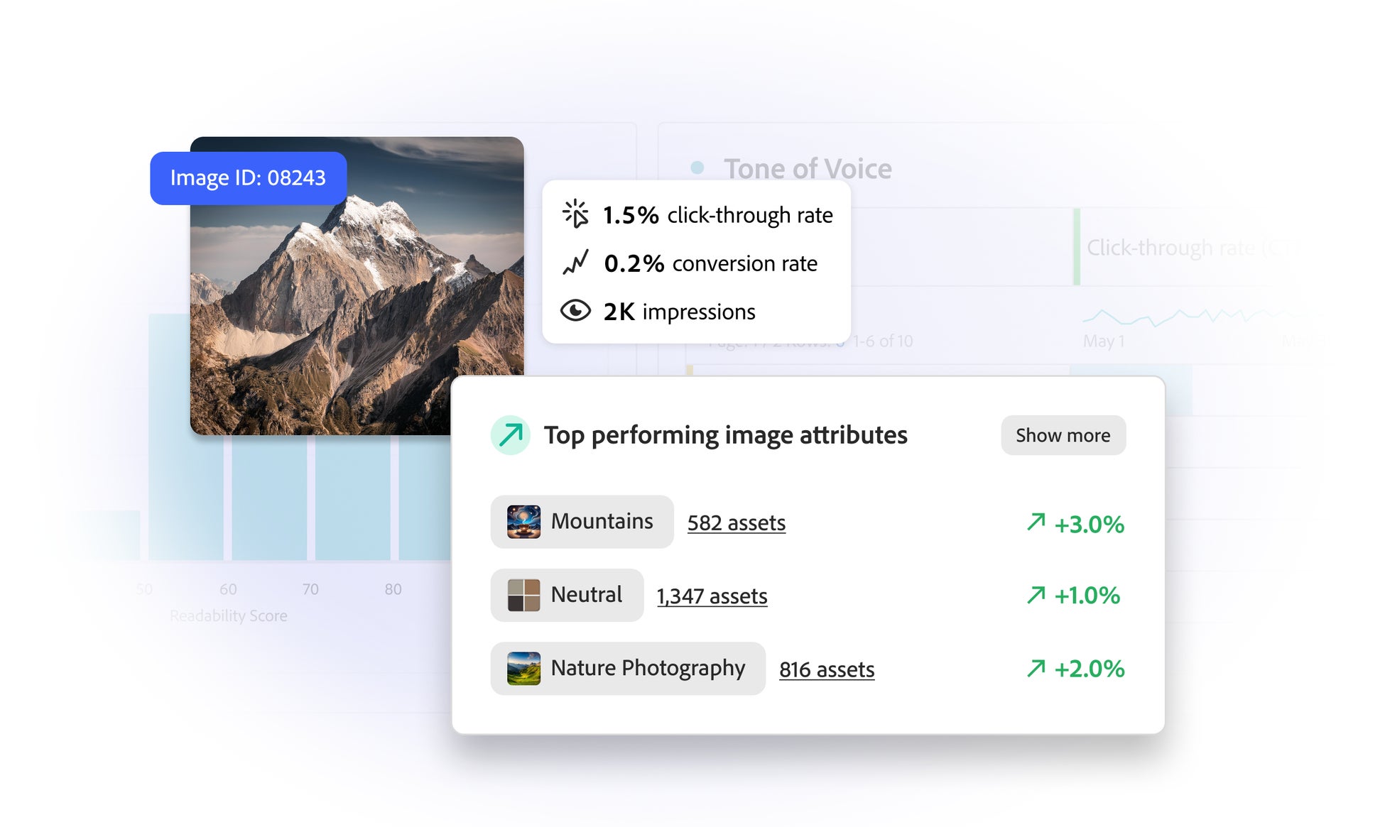 アドビは最新ソリューションにより、ブランド企業がより高いパフォーマンスを実現し、顧客エンゲージメントのビジネス目標を達成できるよう支援します。Adobe Experience Cloudの新機能は生成AIコンテンツをパーソナライズ、テストおよび測定します。「Adobe Content Analytics」は、実行可能なインサイトにより、ターゲットオーディエンスに最も響くコンテンツの属性を特定し、今後どんなコンテンツを作成するべきかの情報を提供します。Adobe Experience Managerは、web上でのリアルタイム実験により、webサイトの訪問者をAIによって生成されたコンテンツのバリエーションに誘導し、最高のコンバージョンをもたらします。さらにAdobe Journey Optimizerでは、パフォーマンス目標に基づいてマーケティングコンテンツの複数のバリエーションを即座に生成し、テストと最適化を自動化することができます。