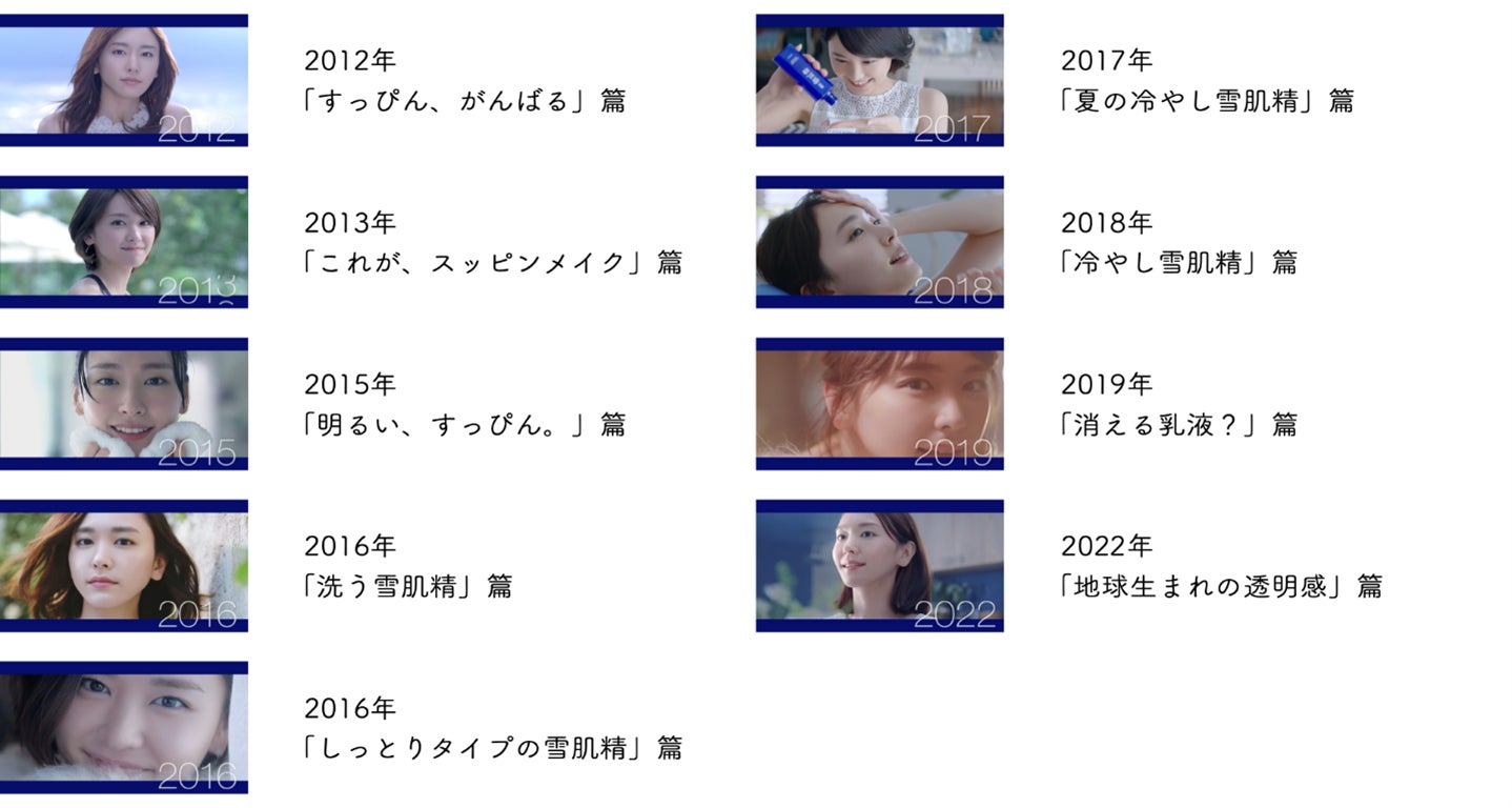 新CMでは、新垣結衣さんが出演する過去のCMから9つの映像が登場。ミューズとして初出演したCM「すっぴん、がんばる」篇(2012年)から、昨年羽生結弦選手との声の共演で話題になった「地球生まれの透明感」篇(2022年)まで、11年分の新垣さんを振り返る内容になっています。長年『雪肌精』を使用している新垣さんの雪のような透明感にご注目ください。
