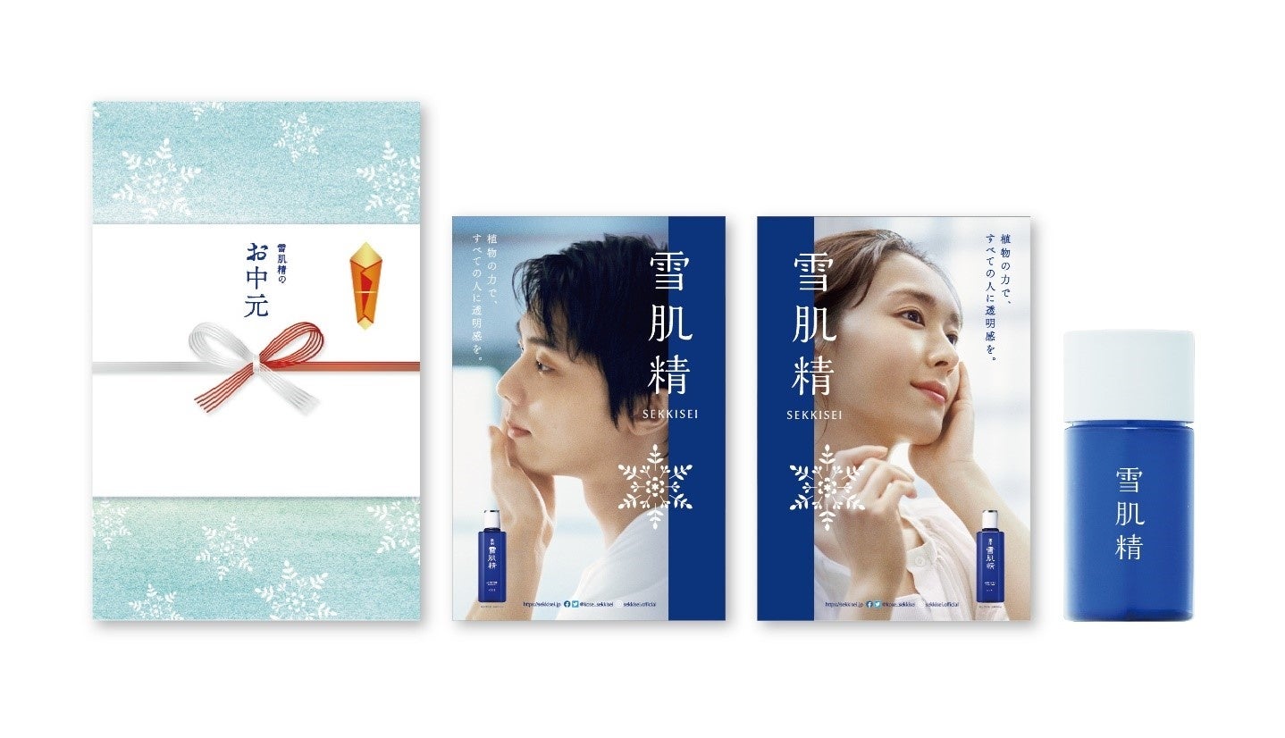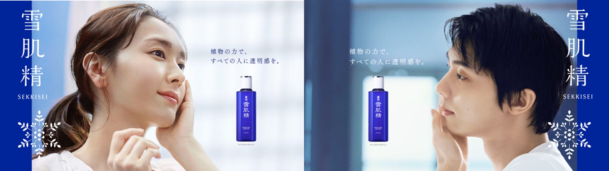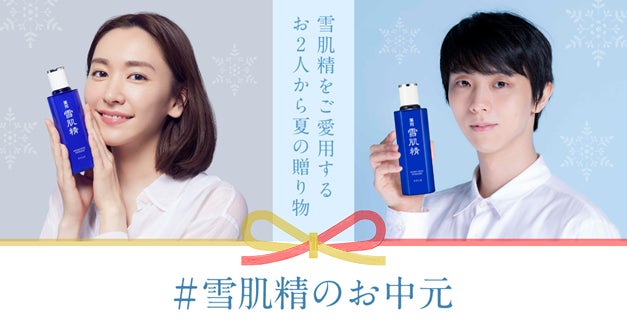 新CM公開および「#雪肌精のお中元」キャンペーン開始にあたって、新しいキービジュアルを公開しました。昨年に引き続き、新垣さんと羽生選手のお2人に登場いただき、『雪肌精』を使うことで得られる透明感を表現。性別や年齢を問わず使え、自然のめぐみで作られているブランドであることを伝えます。