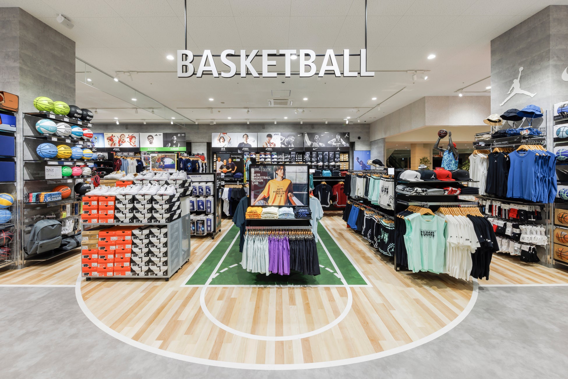 コートをイメージした売場に、人気のJORDANブランドシグネイチャーシューズ(LUKA、TATUMなど)やアパレルが充実のラインナップ。実際の使用シーンをイメージしながらお買い物をお楽しみいただます。その他、asicsやUNDER ARMOUR、InThePaintなどの人気ブランドはもちろんのこと、ファッションを楽しみたい方にもおすすめのTIGORA×AKTRコラボウェアなどオリジナル商品の取り扱いも多数ございますので、初心者から上級者の方までお楽しみいただる品揃えとなっております。