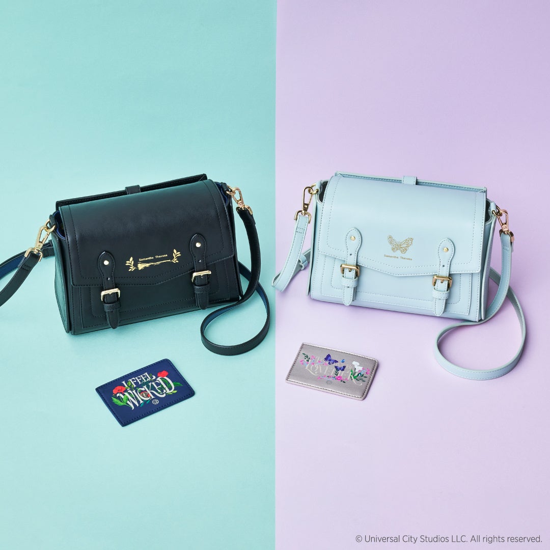 物語の中でエルファバ、グリンダが着用しているドレスをイメージしたカラーがショルダーバッグに。エルファバの魔法を連想させるほうきのモチーフ、グリンダの優美な印象をイメージした光輝く蝶がそれぞれにデザインされていて、ワンポイントに。