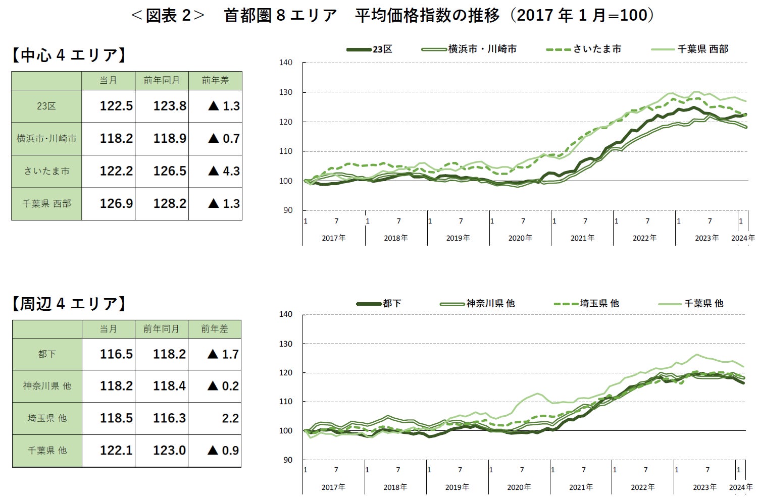 首都圏全体の平均価格は前月比-0.2%と2カ月連続で下落した。また、前年同月比は-0.1%となり、2020年6月以来44カ月ぶりに前年同月を下回った。