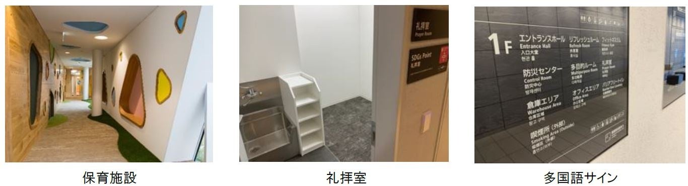 多様な人々が共に働ける環境を目指し、保育施設や、礼拝室、多国語サイン、ジェンダーレストイレ等を設置しています。また、売店・カフェテリアスペース、ラウンジ、デッキテラス等、共用部の更なる充実や、従業員向けのポータルサイトを提供し利便性の向上を図り、従業員の皆さまにより快適な環境を提供することで、従業員の働きがい向上や労働環境の改善、雇用確保に寄与します。
