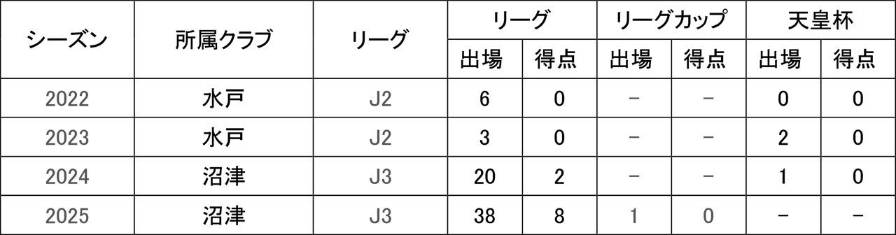 所属歴:鹿島アントラーズジュニア – 鹿島アントラーズJrユース – 鹿島アントラーズユース – 水戸ホーリーホック – アスルクラロ沼津