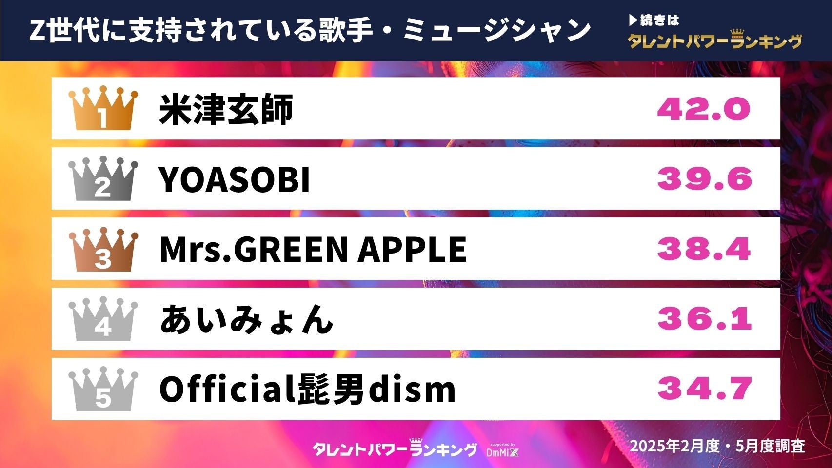 『タレントパワーランキング』では、タレントパワーランキングに登録されている、歌手・ミュージシャンについて、Z世代(10代〜20代後半の男女)が回答した結果のスコアを調査。