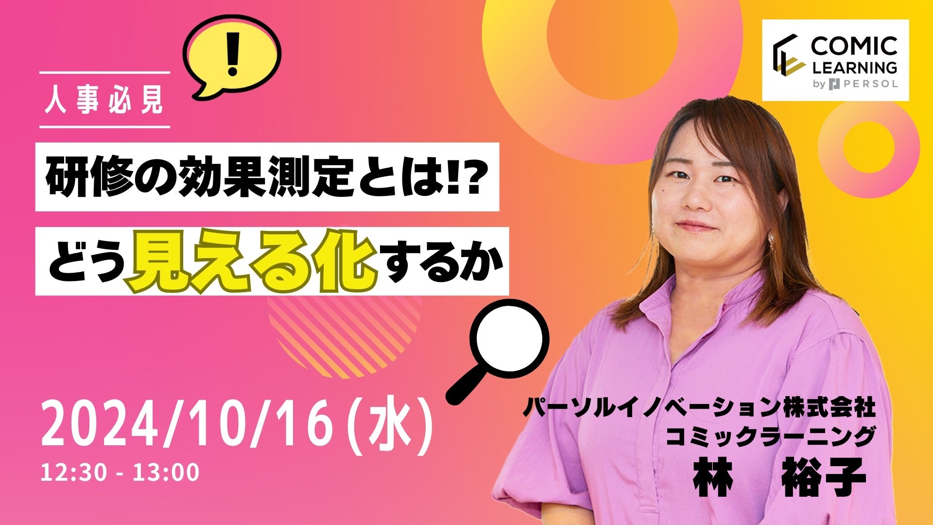 「はたらいて、笑おう。」をビジョンに掲げるパーソルグループのパーソルイノベーション株式会社 Comic Learning Company(本社:東京都港区、Comic Learning Company 代表:仙波 敦子)が展開するコミック教材を活用した研修サービス『コミックラーニング』は、“人事必見!研修の効果測定とは!?どう「見える化」するか”と題し、オンラインセミナーを2024年10月16日(水)12:30~13:00に開催します。お昼休みの時間を使って、短時間で気軽に学ぶことができます。