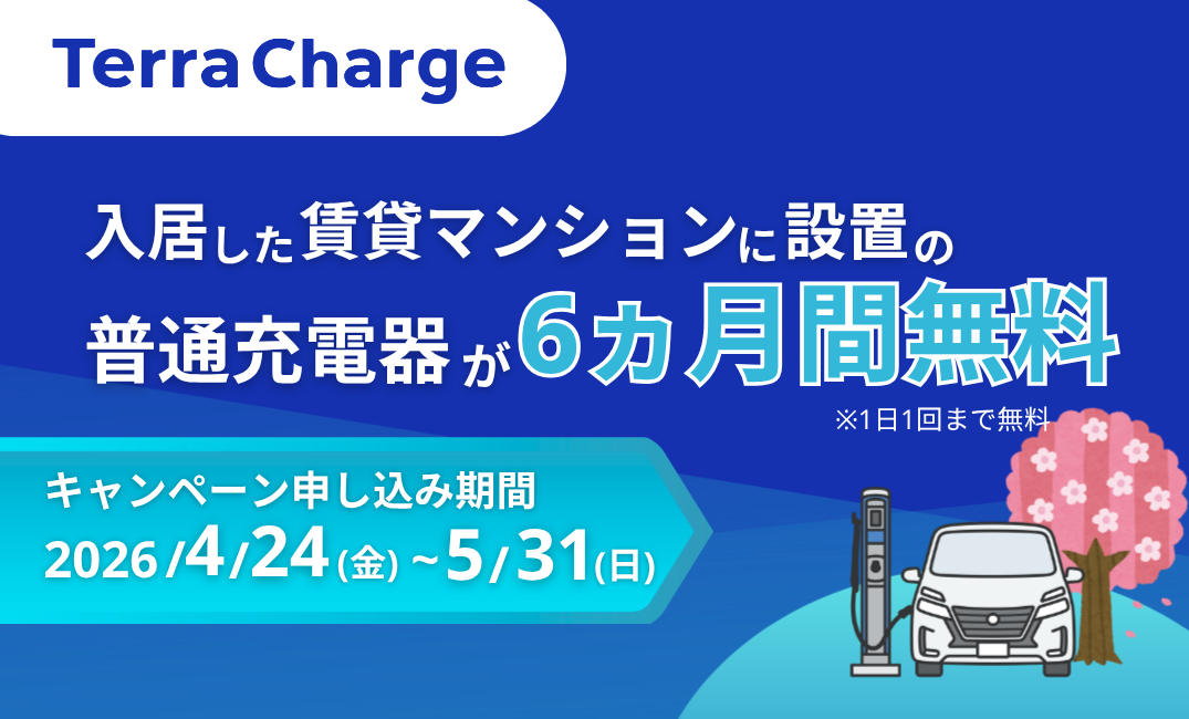 EV(電気自動車)向け充電サービス「Terra Charge(テラチャージ)」を展開するTerra Charge 株式会社(本社:東京都港区、代表取締役社長:徳重徹、以下「当社」)は、入居したマンションに設置されている普通充電器が6ヵ月間無料になるキャンペーンを2026年4月24日(金)より開始いたします。