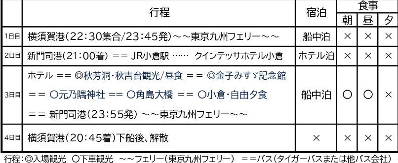 ※添乗員/現地同行(2日目新門司港下船時~3日目小倉駅送迎バス乗車時)