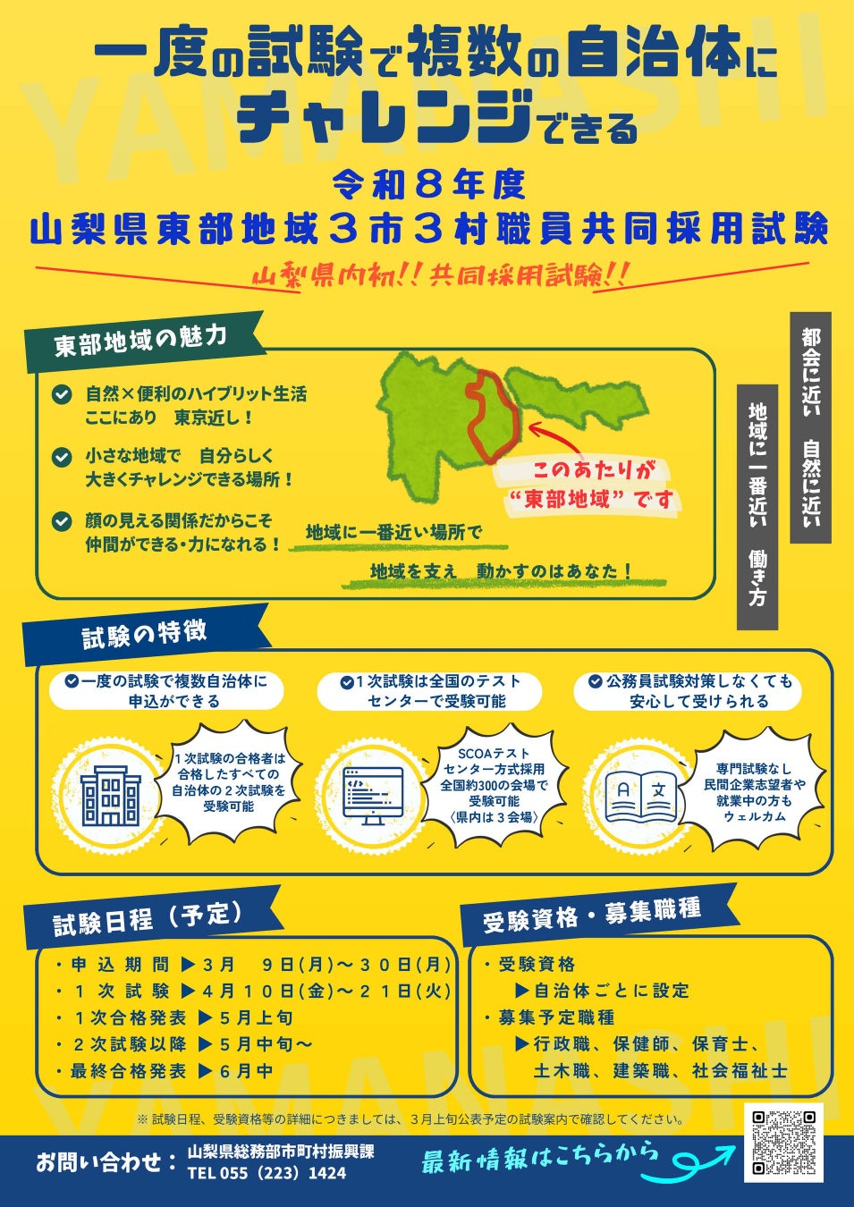 山梨県(知事 長崎 幸太郎)は、県東部地域の3市3村と連携し、県内で初となる「共同採用方式」による市町村職員採用試験を実施します。本試験は従来の公務員試験と比べて受験しやすい内容となっており、より多くの方に挑戦していただける試験となっています。