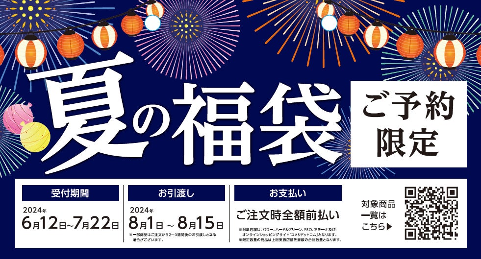 毎年、お客様から大変ご好評のコメリの「夏の福袋」が今年も販売いたします。コメリが自信をもってご提供する工具、家電、自転車、園芸機器など、期間限定、予約販売だからこそ実現できる価格・特典でご用意。予約受付期間は2024年6月12日(水)~7月22日(月)まで。