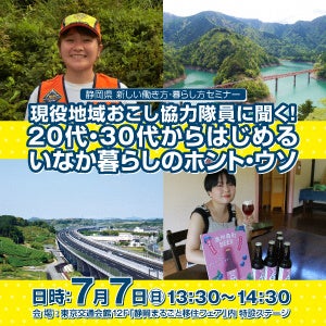 移住希望地ランキング4年連続日本一の静岡県が送るセミナーのテーマは、「現役地域おこし協力隊員に聞く!20代・30代からはじめるいなか暮らしのホント・ウソ」。