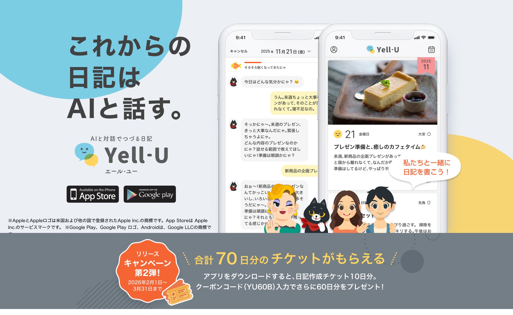 アプリをダウンロードし、クーポンコード「YU60B」を入力すると60日分の日記作成チケットをプレゼントします