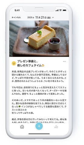 「Yell-U(エール・ユー)」は、AIパートナーとチャットでやり取りするだけで日記が完成する新感覚のAI日記アプリです。今日あったことや感じたことを話すと、AIが会話の内容から自動で日記を作成します。チャットのような操作で気軽に日記が続けられることに加え、ウィークリーレポートや気持ちの変化の可視化など、日々を振り返る体験をサポートしています。