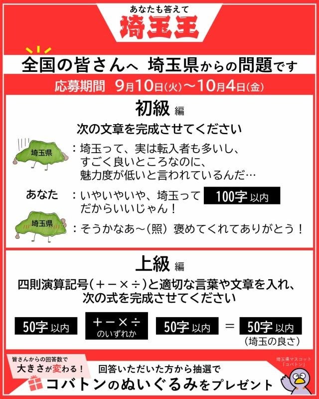 ・応募者から抽選で埼玉県マス コット「コバトン」のぬいぐるみ を 5 人にプレゼントします 。