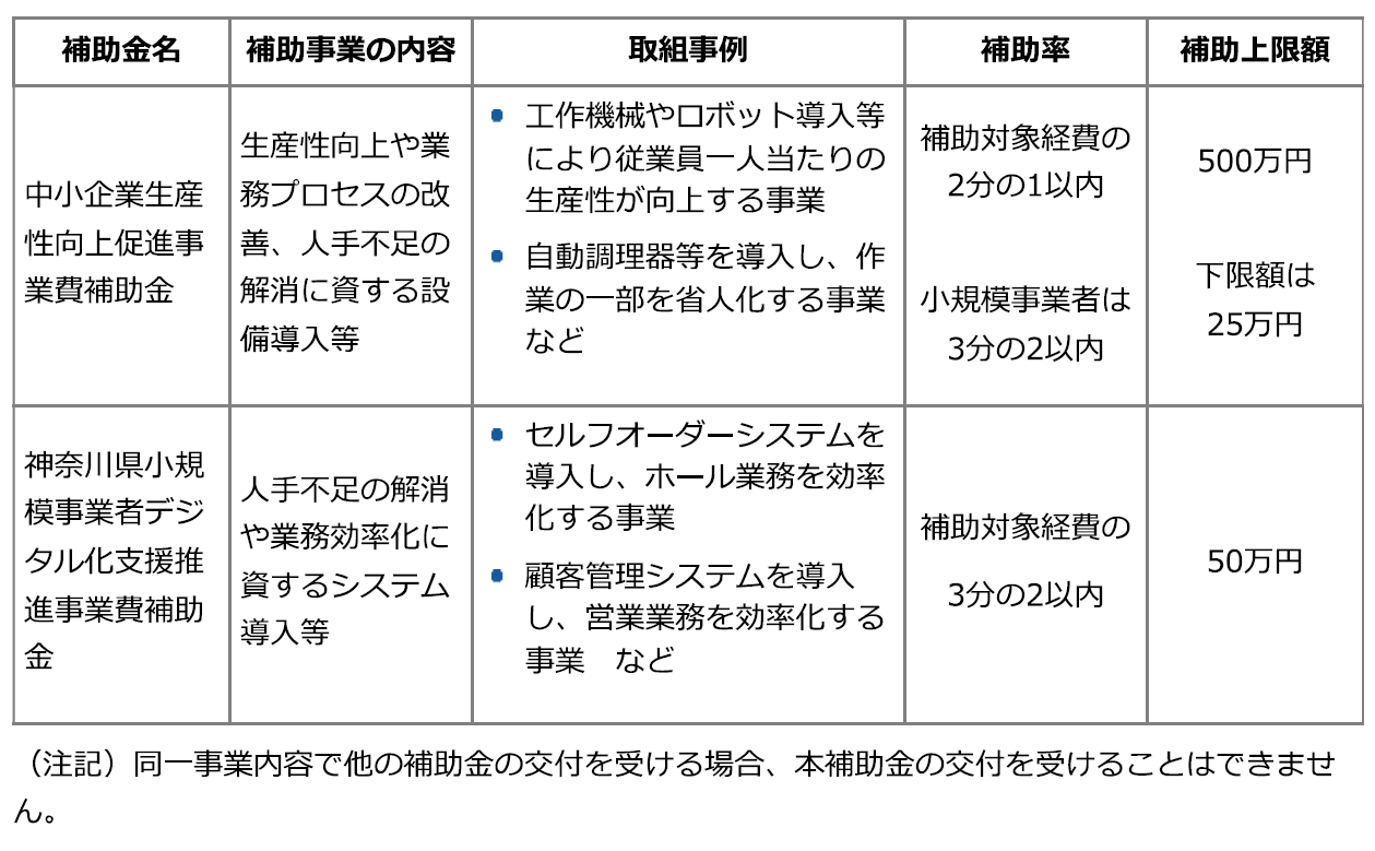 そこで、県ではこのための新たな支援として、事業の効率化や経費節減など生産性向上に資する設備の導入費用の一部を補助する「令和6年度中小企業生産性向上促進事業費補助金」、及び、小規模事業者を対象とした、デジタル化に向けた設備やシステムの導入を促進する「令和6年度神奈川県小規模事業者デジタル化支援推進事業費補助金」の公募を開始します。