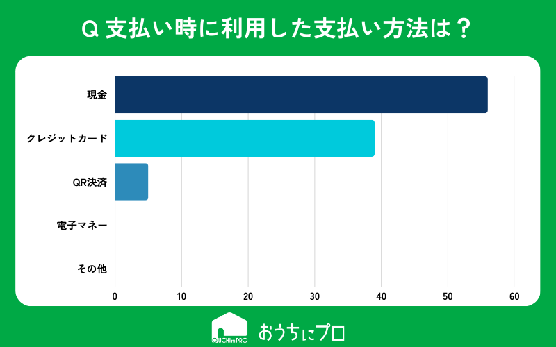 エアコンクリーニング料金の支払い方法は「現金」が最も多く、それに迫るほどに「クレジットカード」の利用も多い。