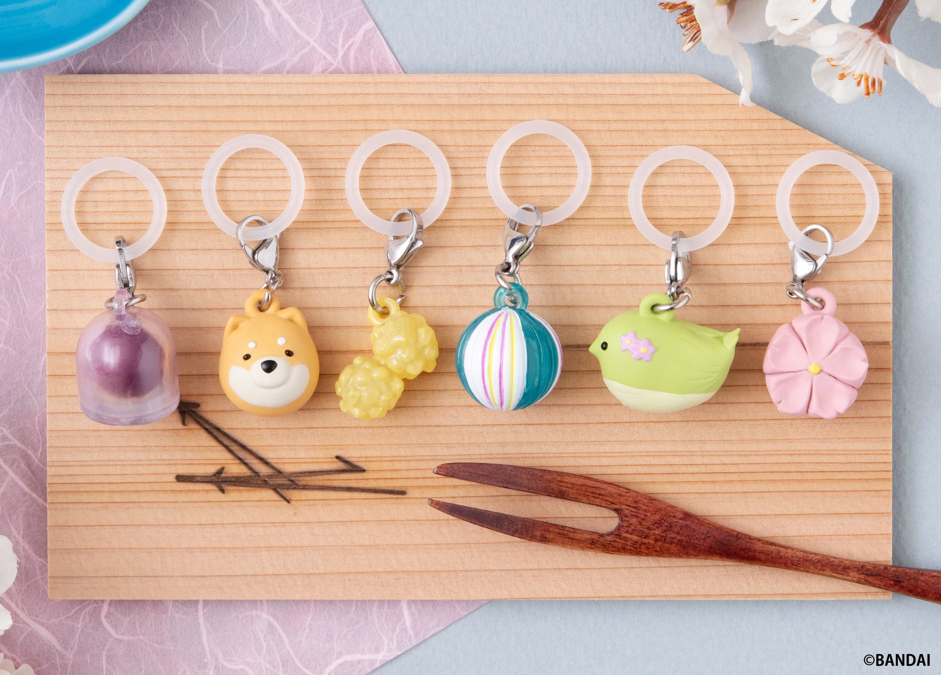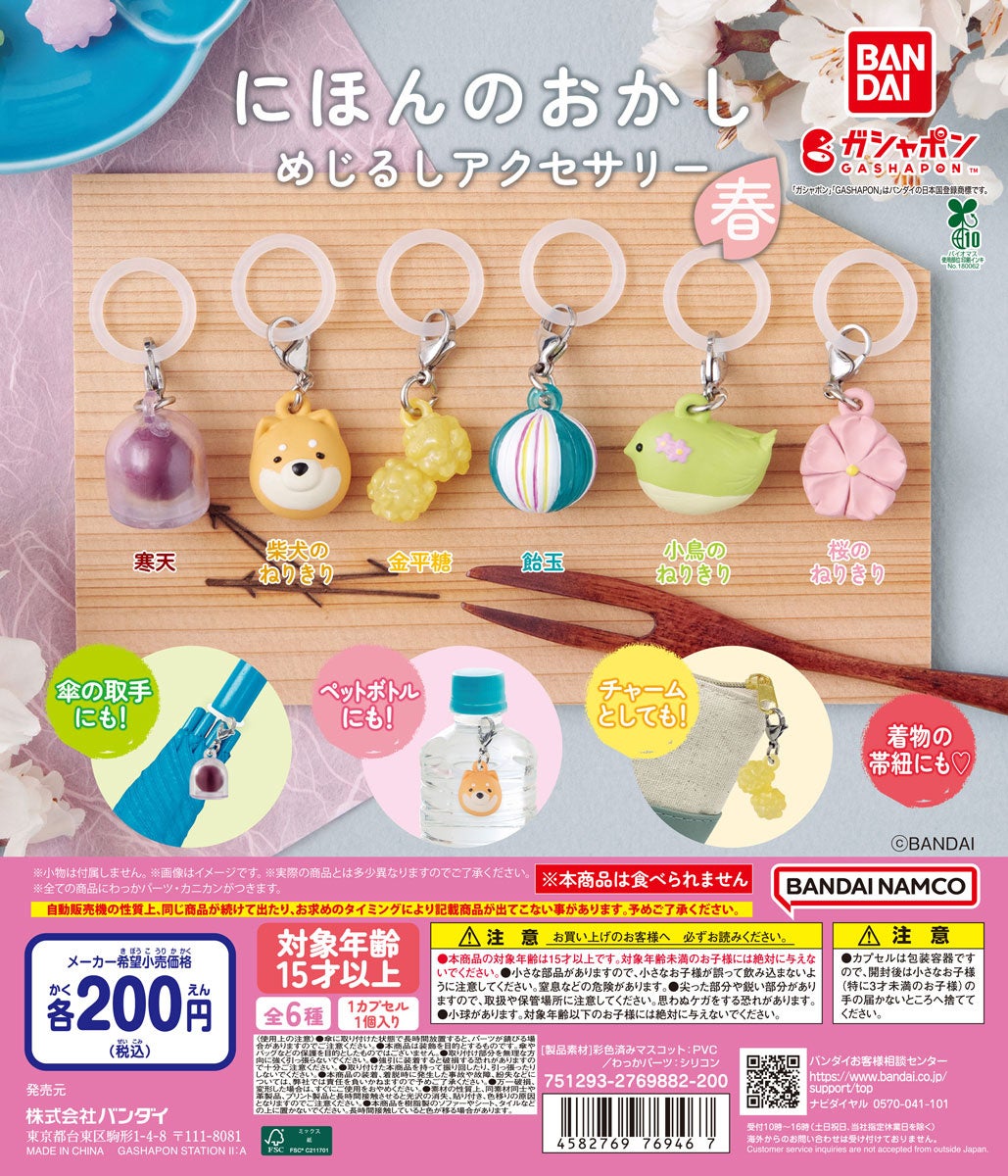株式会社バンダイ ベンダー事業部(本社:東京都台東区)は、和菓子をモチーフにしたオリジナルデザインのめじるしアクセサリーシリーズ第一弾として『にほんのおかし めじるしアクセサリー ~春~』(1回200円・税10%込、全6種)を2025年4月第4週より全国のガシャポンバンダイオフィシャルショップ、玩具売場、量販店、家電店などに設置されたガシャポン自販機シリーズにて発売いたします。