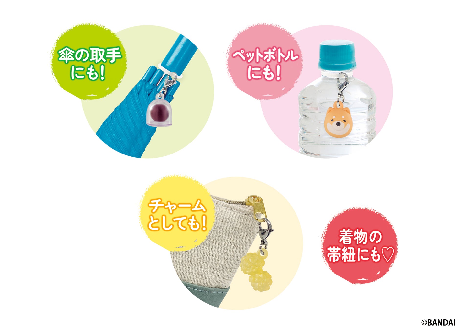 本商品は、付属のカニカンとシリコンパーツを傘やペットボトルなどにつけることで、自分の持ち物の”めじるし”として使用することができる「めじるしアクセサリー」シリーズの、和菓子をモチーフにしたガシャポンオリジナルデザインの商品です。マスコットは全高約16~20mmで、実際の和菓子のようにクリア素材やマットな質感で本物そっくりに再現しています。傘の取手、ペットボトル、ポーチなどのチャームとしても、着物の帯紐につけて使用してもかわいいアイテムです。