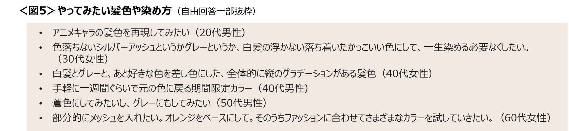 やってみたいカラーリングは、メッシュやグラデーション、色落ちしても気にならない色、手軽に元に戻せるものなどがあがった。<図5>