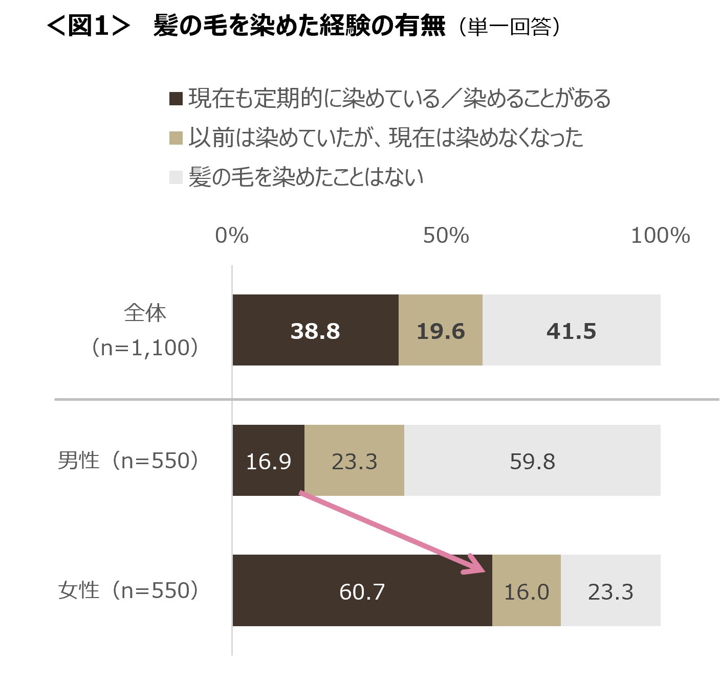 「現在も定期的に染めている/染めることがある」人は男性では16.9%と2割を下回り、性別により大きな差がみられる。
