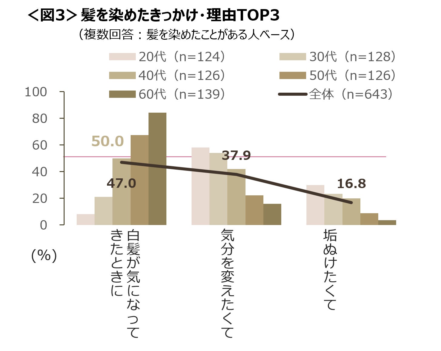 髪を染めたきっかけとしては、「白髪が気になってきたときに」が47.0%でTOP。20代~30代では気分を変えたいときや垢ぬけたいときに髪を染める人が目立つ。<図3>