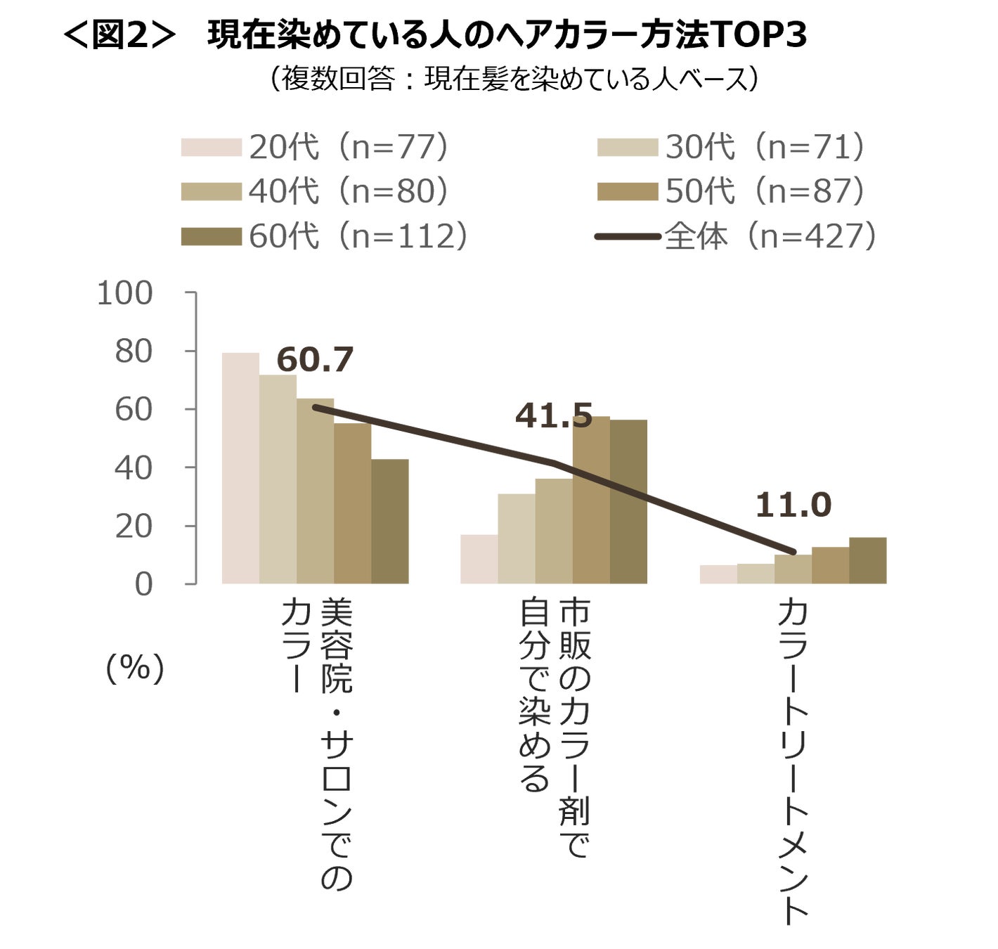 現在髪を染めている/染めることがある人は約4割。女性では6割を占める。若年層ほど美容院・サロンで、年代が上がると市販のカラー剤で染める人の割合が高くなる。<図1・2>