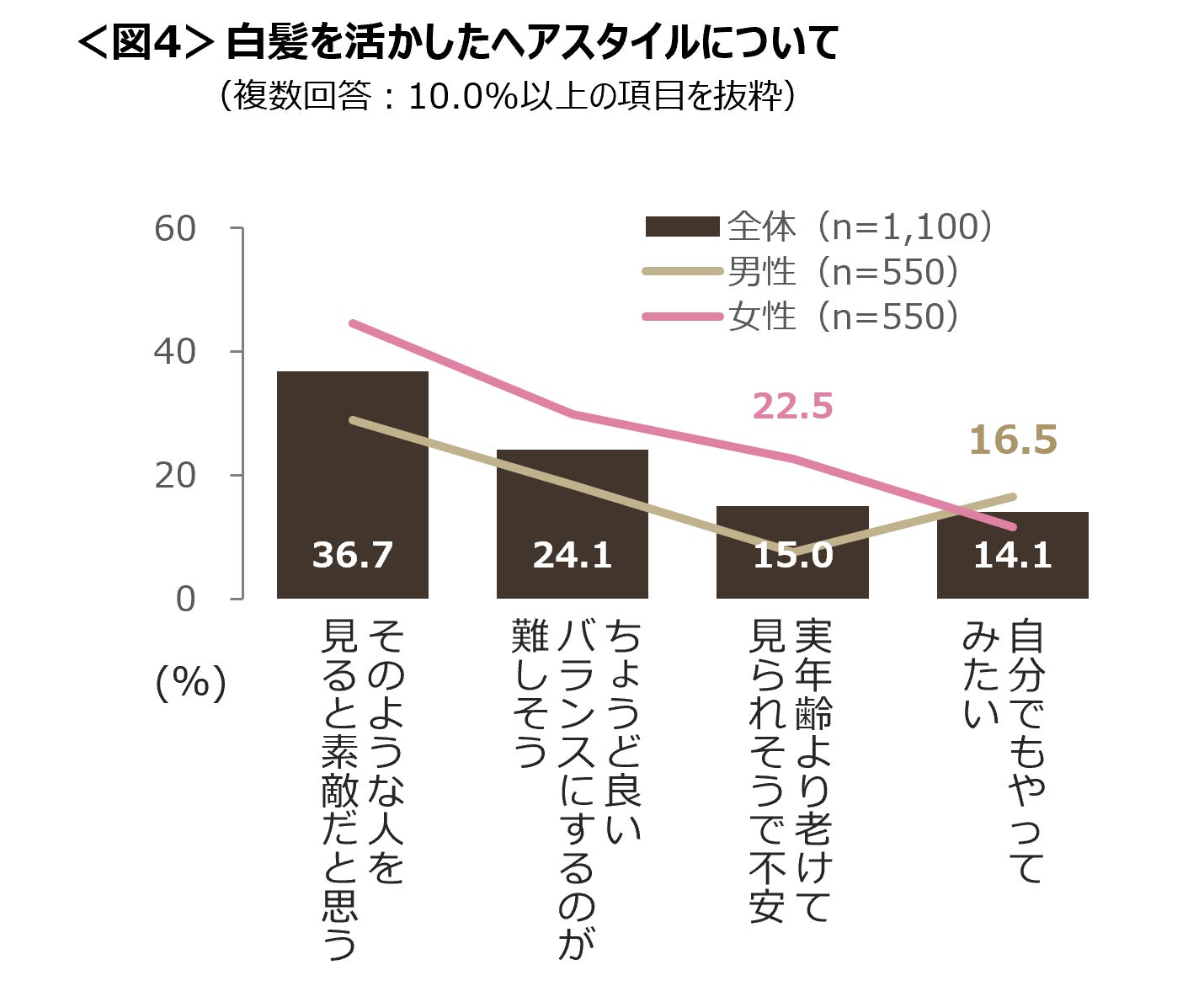 白髪を活かしたヘアスタイルの印象について「そのような人を見ると素敵だと思う」が36.7%で最も多い。<図4>