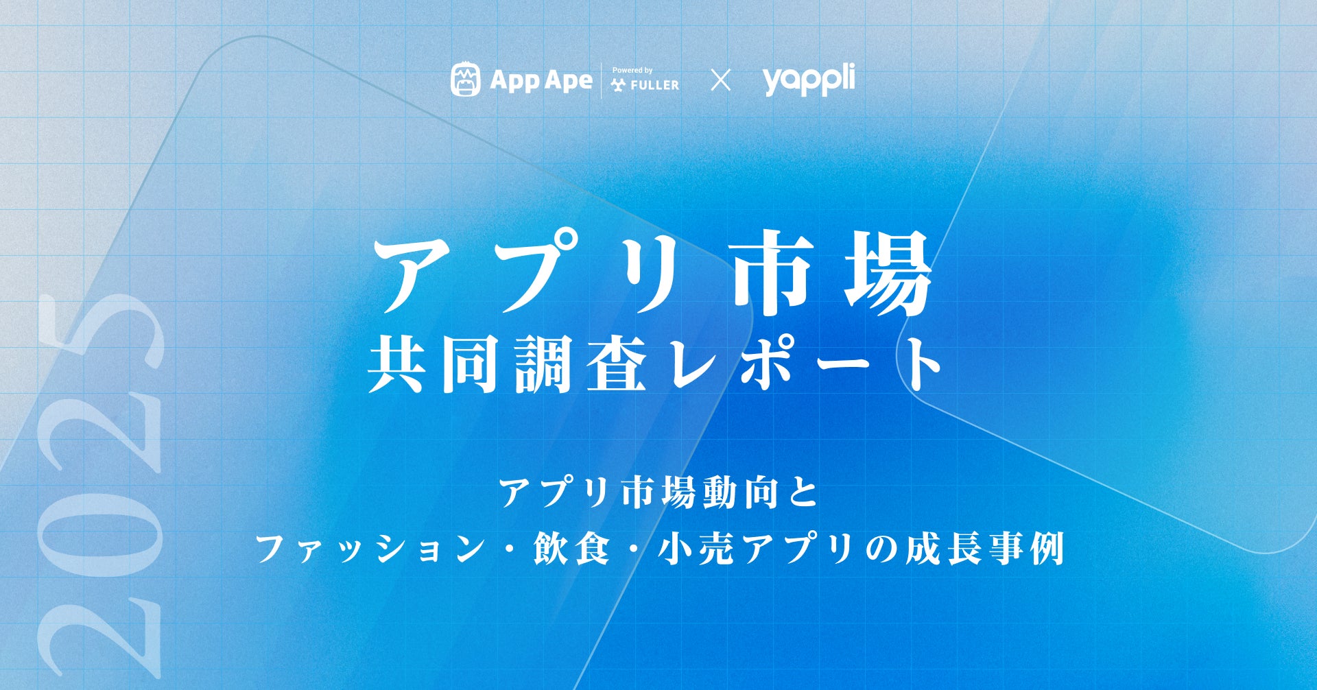 フラー株式会社(本社:新潟県新潟市、代表取締役社長:山﨑将司、以下「フラー」)およびアプリプラットフォーム「Yappli(ヤプリ)」を提供する株式会社ヤプリ(本社:東京都港区、代表取締役:庵原保文、以下「ヤプリ」)は、アプリ市場分析サービス「App Ape(アップ・エイプ)」のデータと、アプリ開発・運用支援プラットフォーム「Yappli(ヤプリ)」の知見をもとに、アプリ市場の動向や注目カテゴリの特徴をまとめた「アプリ市場共同調査レポート2025」を公開しました。