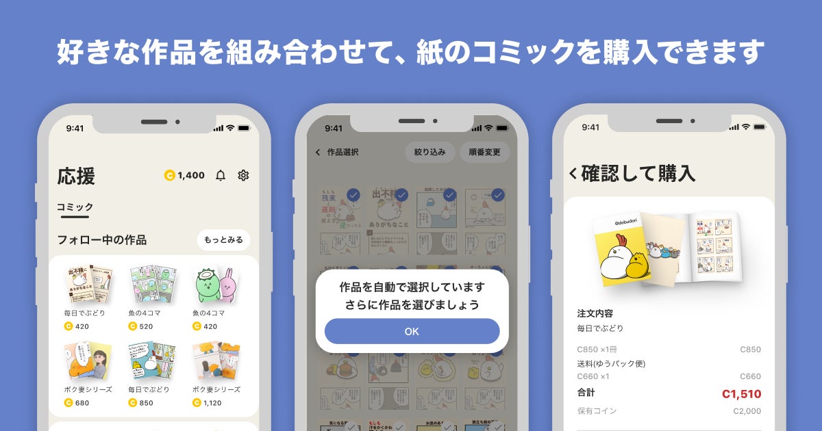 「YOMcomaコミック」は、アプリユーザーが好きな作品を自由に選び、紙のコミックを作成して購入できる機能です。コミックのページ数は、作品点数によって自動で切り替わります(最小24ページ〜最大144ページの6種類)。
