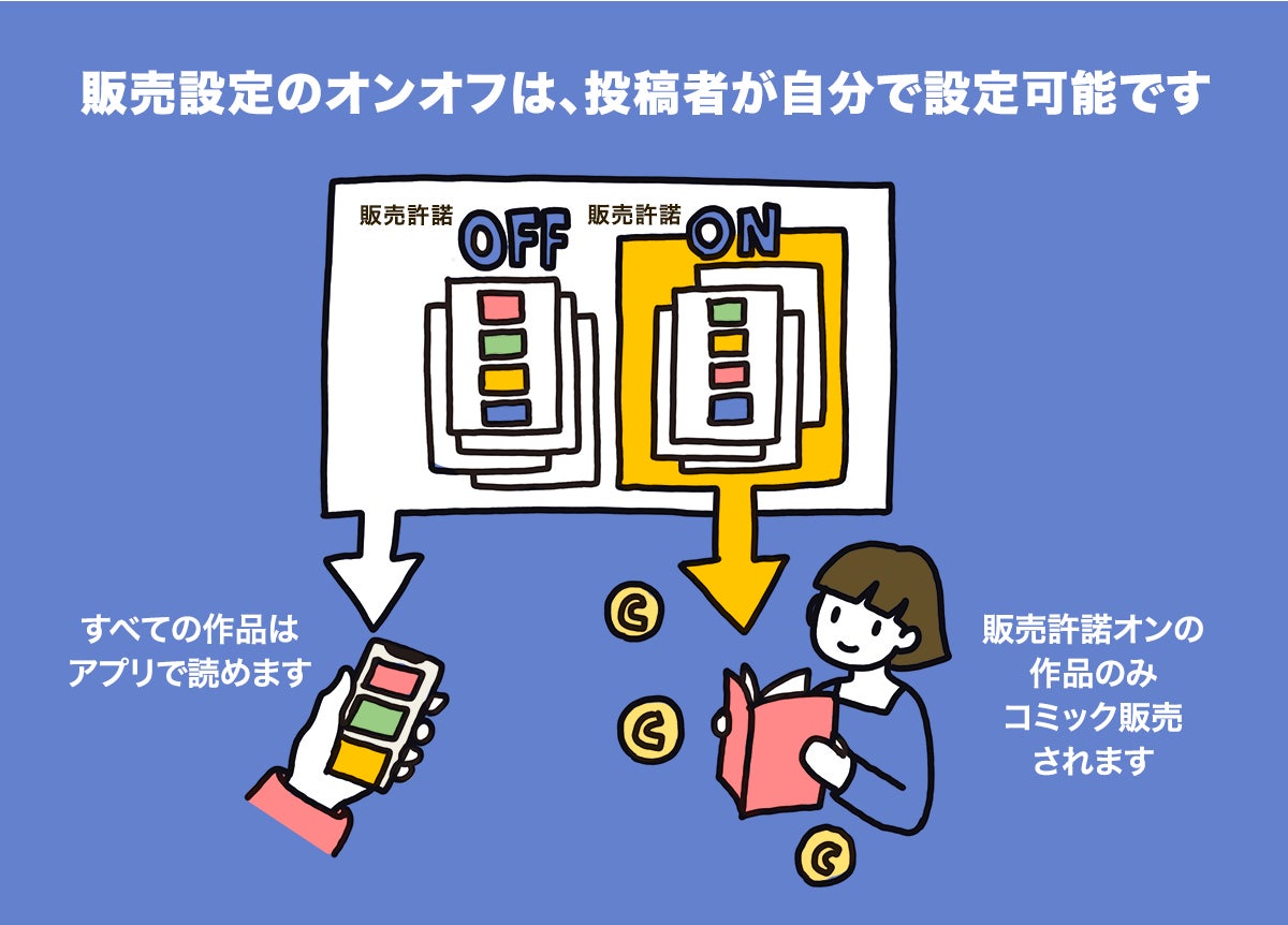 ショートマンガを創作するクリエイターは、「YOMcoma」に作品を投稿しておくだけでOK。「YOMcoma」の管理画面上で、作品ごとの販売許諾をかんたんにオンオフできます。クリエイターが販売許諾をした作品のみアプリユーザーが選択でき、複数のクリエイターの作品を1冊にまとめる形でコミックが作成されます。