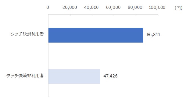 さらにタッチ決済利用有無別に、該当するクレジットカードの1か月あたりの利用金額を分析したところ、タッチ決済利用者の利用金額は約8.7万円となり、タッチ決済非利用者に比較して1.8倍高くなりました。現状ではクレジットカードのタッチ決済利用者は3割弱にとどまるものの、スーパーやコンビニエンスストアなどの日常の買い物シーンにおけるクレジットカード利用が増え、クレジットカードの利用金額も増加していることがうかがえる結果となりました。