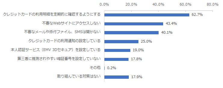 クレジットカード会社においては、不正利用を防ぐためのモニタリングや本人認証サービス(EMV 3Dセキュア)の導入、業界全体での不正疑いのある情報の共有などの取り組みのほか、利用者に対して不正利用から身を守るための啓発などの取り組みを行っています。そこで、クレジットカードの利用において、不正利用から身を守るために利用者自身が取り組んでいる対策について調査したところ、最も高くなったのは「クレジットカードの利用明細を定期的に確認するようにする」(62.7%)となり、ついで「不審なWebサイトにアクセスしない」(43.4%)、「不審なメールや添付ファイル、SMSは開かない」(40.1%)が続きました。