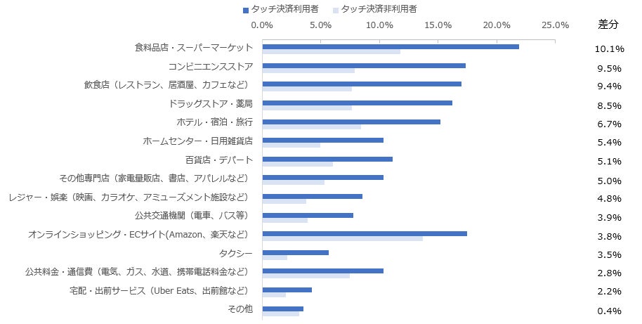 また、タッチ決済利用有無別に、3~5年前と比べてクレジットカードの利用頻度が増えたシーンを調査したところ、タッチ決済利用者はタッチ決済非利用者と比べて、いずれのシーンにおいても利用シーンが増えたと回答した割合が高くなりました。その中でも、最も差分が大きくなったのは「食料品店・スーパーマーケット」となり、次いで「コンビニエンスストア」、「飲食店(レストラン、居酒屋、カフェ)」といったシーンが続きました。