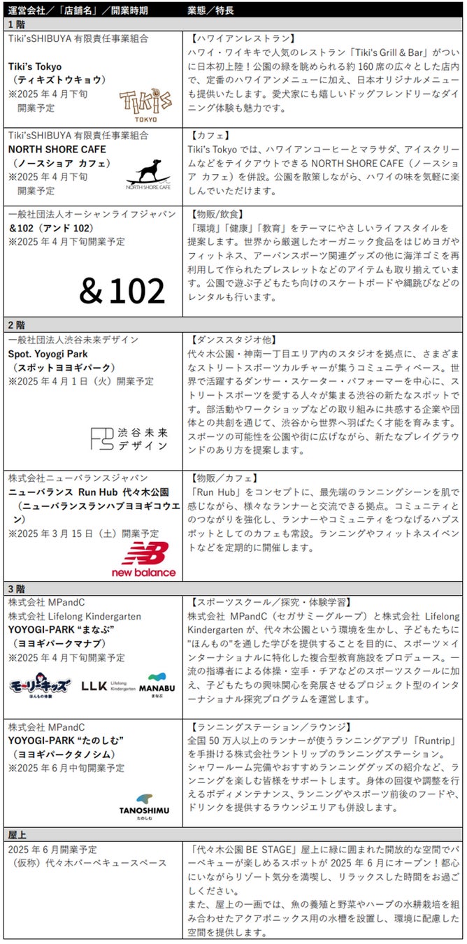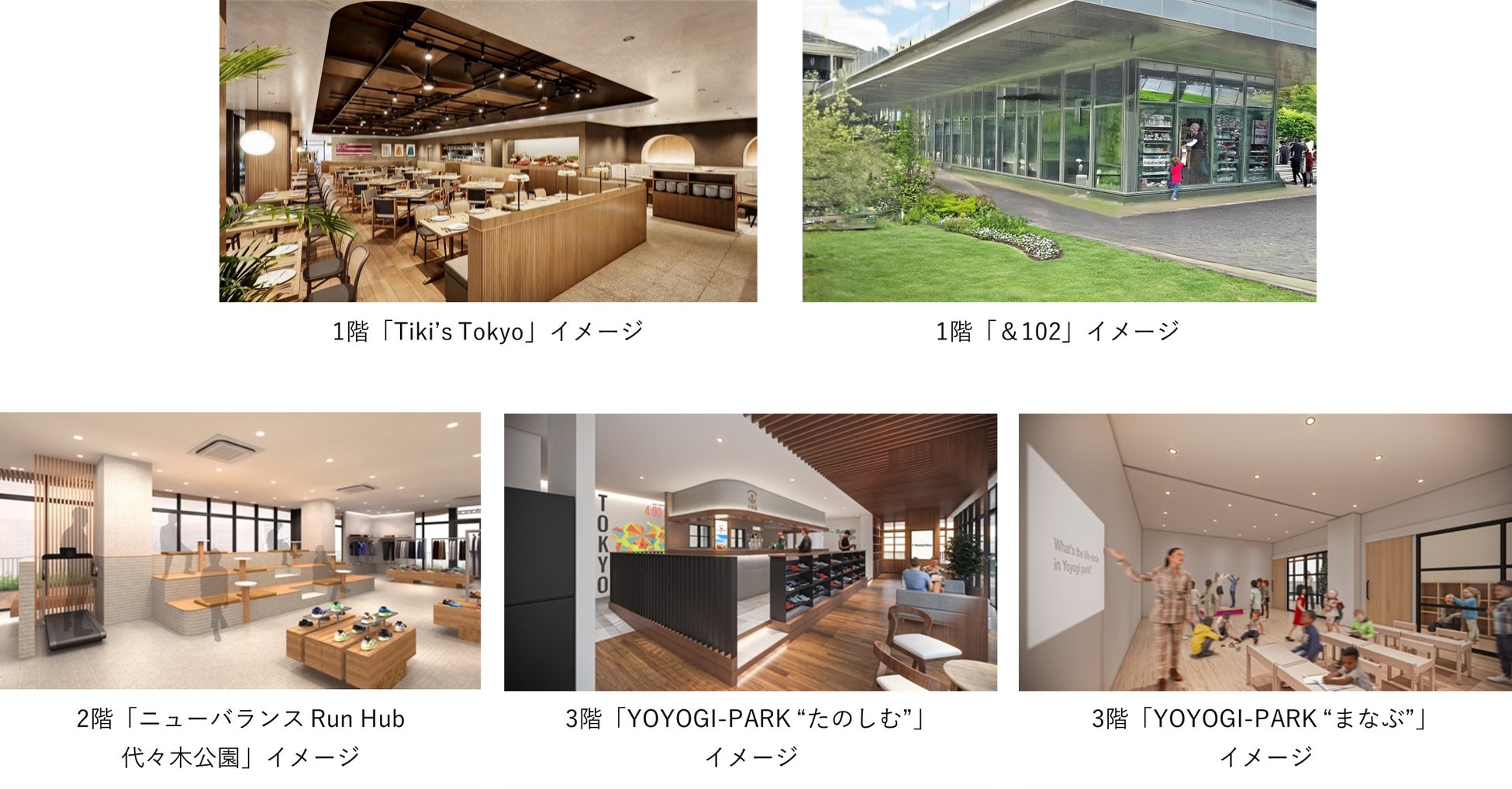 株式会社ニューバランスジャパンは、2階にRun Hubとなる店舗をオープン。ランニングカテゴリーのプロダクトの展開のほか、定期的にイベントを開催、そしてカフェを併設しランナーたちのコミュニケーションの場を作ります。同フロアには、渋谷区の産官学民連携組織である一般社団法人渋谷未来デザインが、ダンスやストリートスポーツを通じた多様な交流と創造の場となるスタジオを展開し、公園や街におけるスポーツの可能性を拡張します。3階では、「究極のエンタテインメント SPORTSで人々を笑顔にする」をミッションに掲げるセガサミーグループの株式会社MPandC(エムピーアンドシー)が、「まなぶ」をテーマに、一流の指導者による体操・空手・チアなどのスクールや、グローバル教育を展開する株式会社Lifelong Kindergartenと共同で英語での探求・体験学習などを提供します。さらに「たのしむ」をテーマに、ランニングステーション・ボディメンテナンス・人気フィットネスインストラクターによるカフェや子ども向けエクササイズレッスンなどのサービスを提供し、身体的・精神的な健康促進をサポートします。