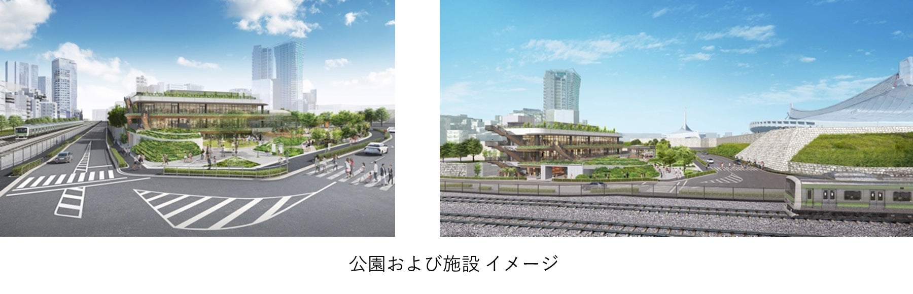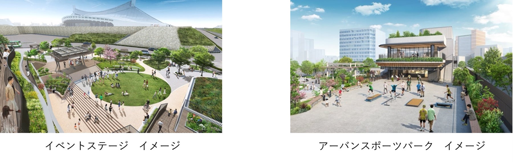 公園における環境面では、四季を感じることができる植栽を多数設置し、また多種多様なベンチで人々が思い思いに過ごせる都心のオアシスをめざします。自由で多彩な自己表現と発信ができる場として、公園の中心部分にイベントステージを設置しました。ステージの周囲はもちろん、JR山手線や代々木競技場の石垣の上など色々な視点から見ることのできるステージを中心に、アート、スポーツなど皆様で楽しむイベントを通じて多くの交流を生み出します。屋外のアーバンスポーツパークは、行う人も見る人も安心してスケートボードなどのアーバンスポーツを楽しめる場所となります。本施設の屋内ゾーンともシームレスにつなぐことも可能な仕様になっています。