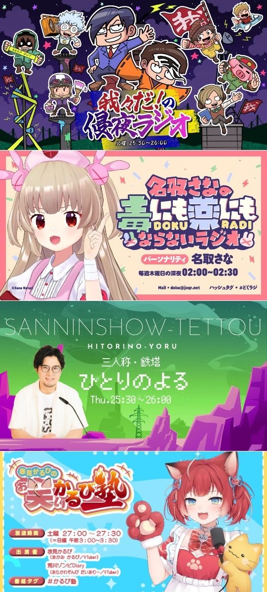 中でも、動画投稿グループ「〇〇の主役は我々だ!」がパーソナリティを務める『我々だ!の侵夜ラジオ』は話題を集め好調な滑り出しを見せているほか、人気VTuber・名取さな出演の『名取さなの毒にも薬にもならないラジオ』、人気ゲーム実況者による『三人称・鉄塔 ひとりのよる』、人気コスプレイヤー・Liyuuが出演する『Liyuuが好きなリユウ』や、同局で人気放送中の『武田鉄矢 今朝の三枚おろし』なども人気です。