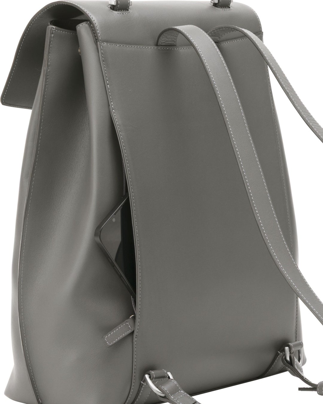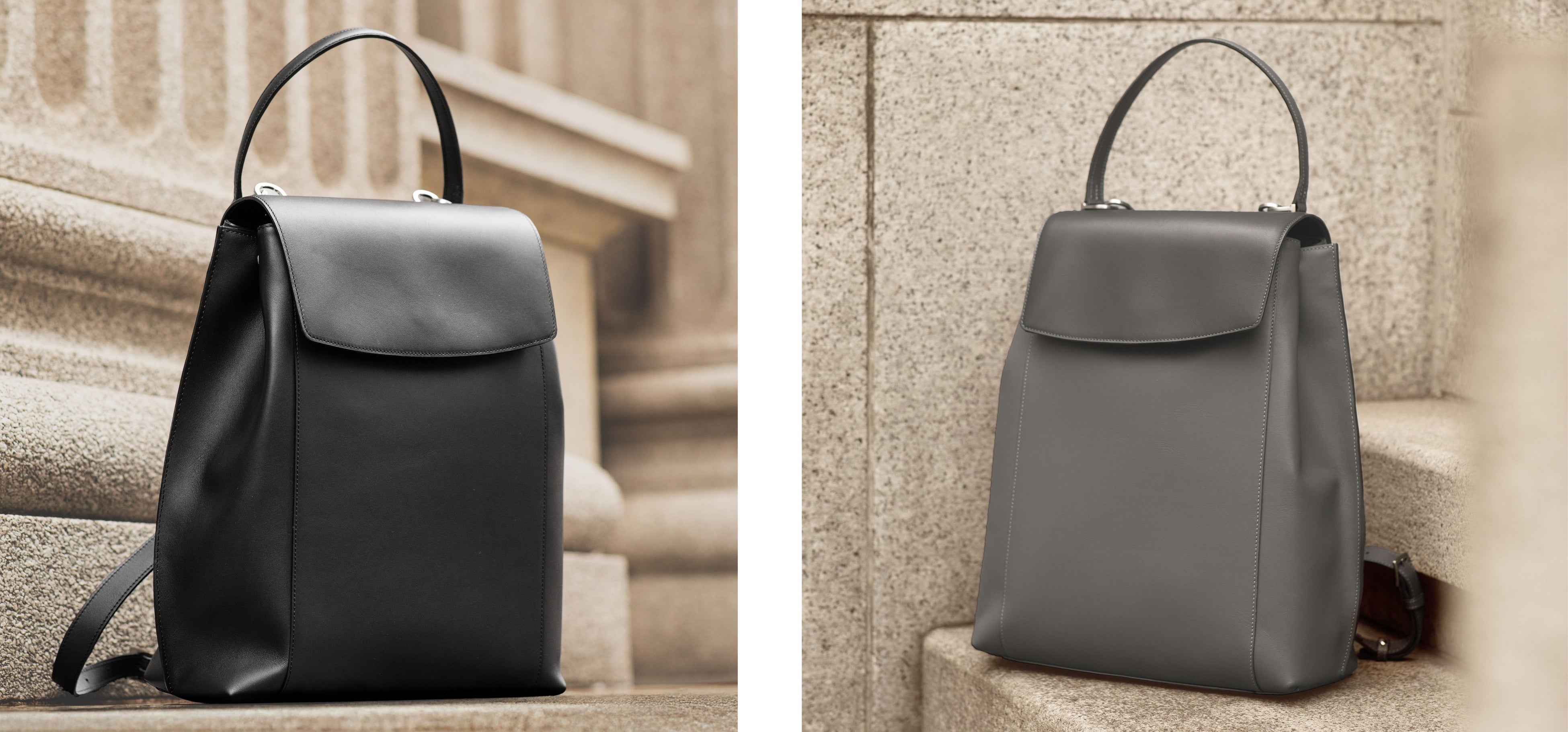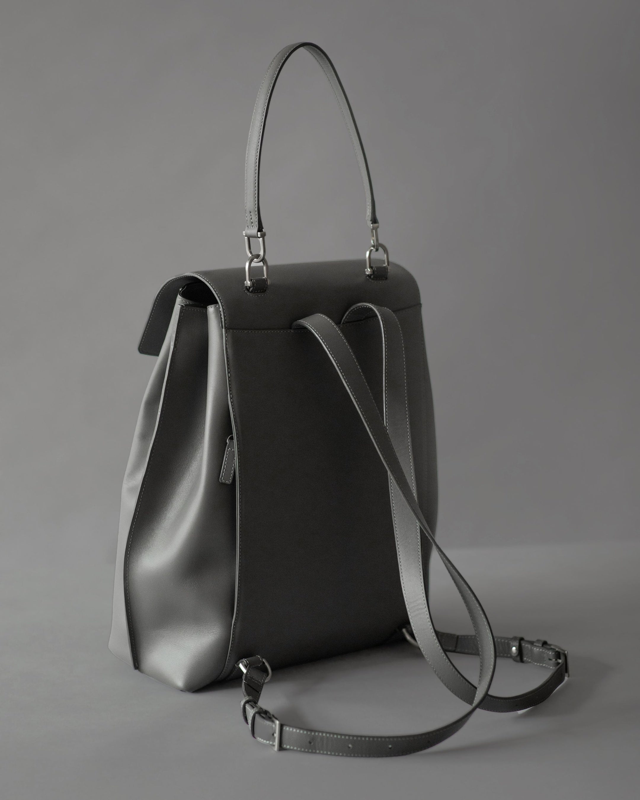 ジャケットやブラウスなどのビジネススタイルにも品良く溶け込む、エレガントな佇まいのレザーバックパックです。背負い姿がカジュアルに寄りすぎないようストラップは細く設計し、トップハンドルでワンショルダーの肩掛けにも対応。背負う・肩掛け・置いたときまで、どのシーンでも端正に見える佇まいを追求しました。