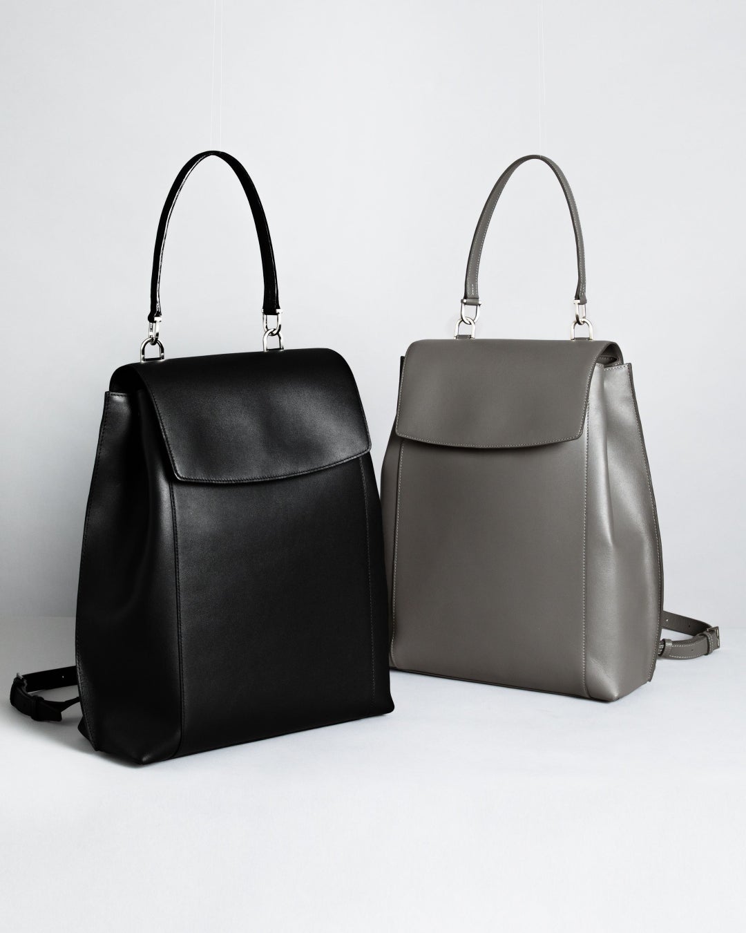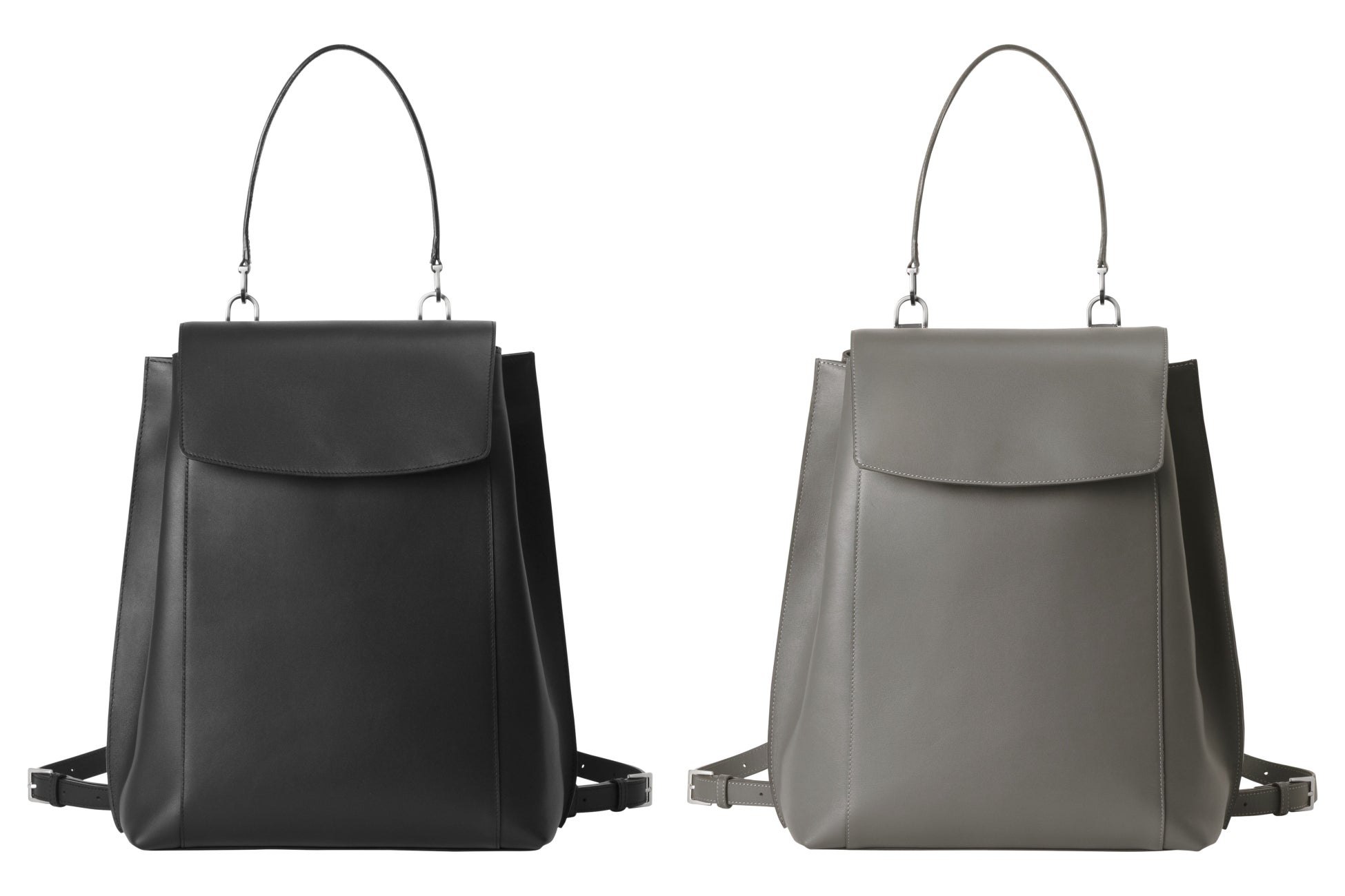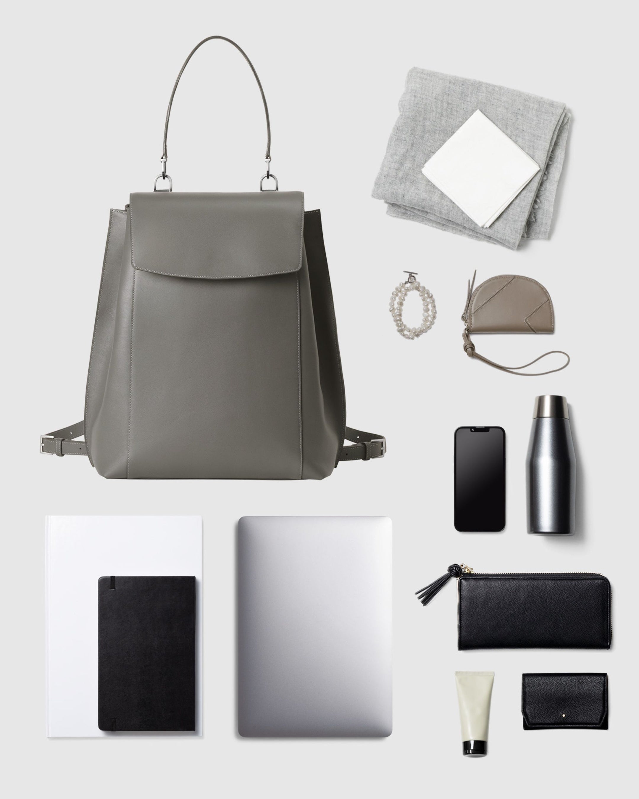 ジャケットやブラウスなどのビジネススタイルにも品良く溶け込む、エレガントな佇まいのレザーバックパックです。背負い姿がカジュアルに寄りすぎないようストラップは細く設計し、トップハンドルでワンショルダーの肩掛けにも対応。背負う・肩掛け・置いたときまで、どのシーンでも端正に見える佇まいを追求しました。