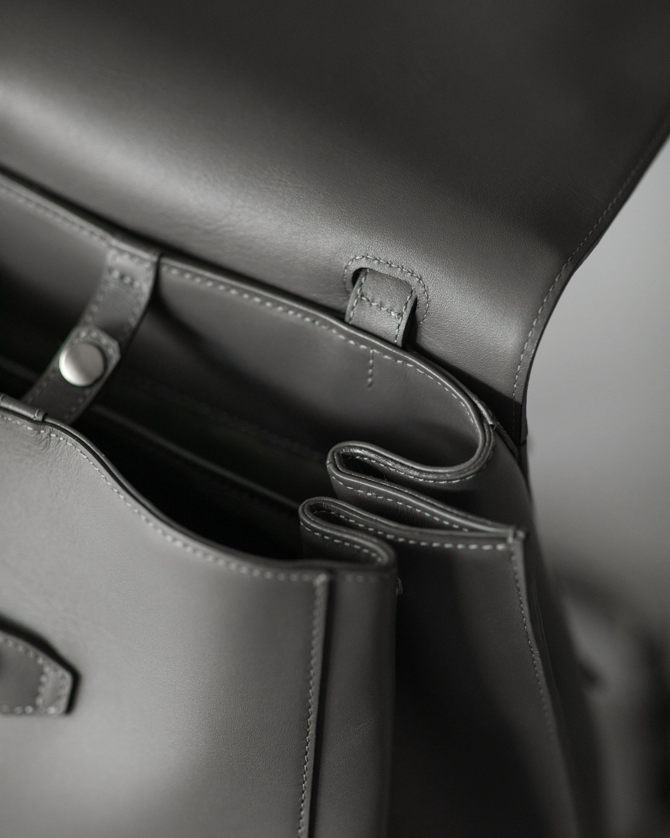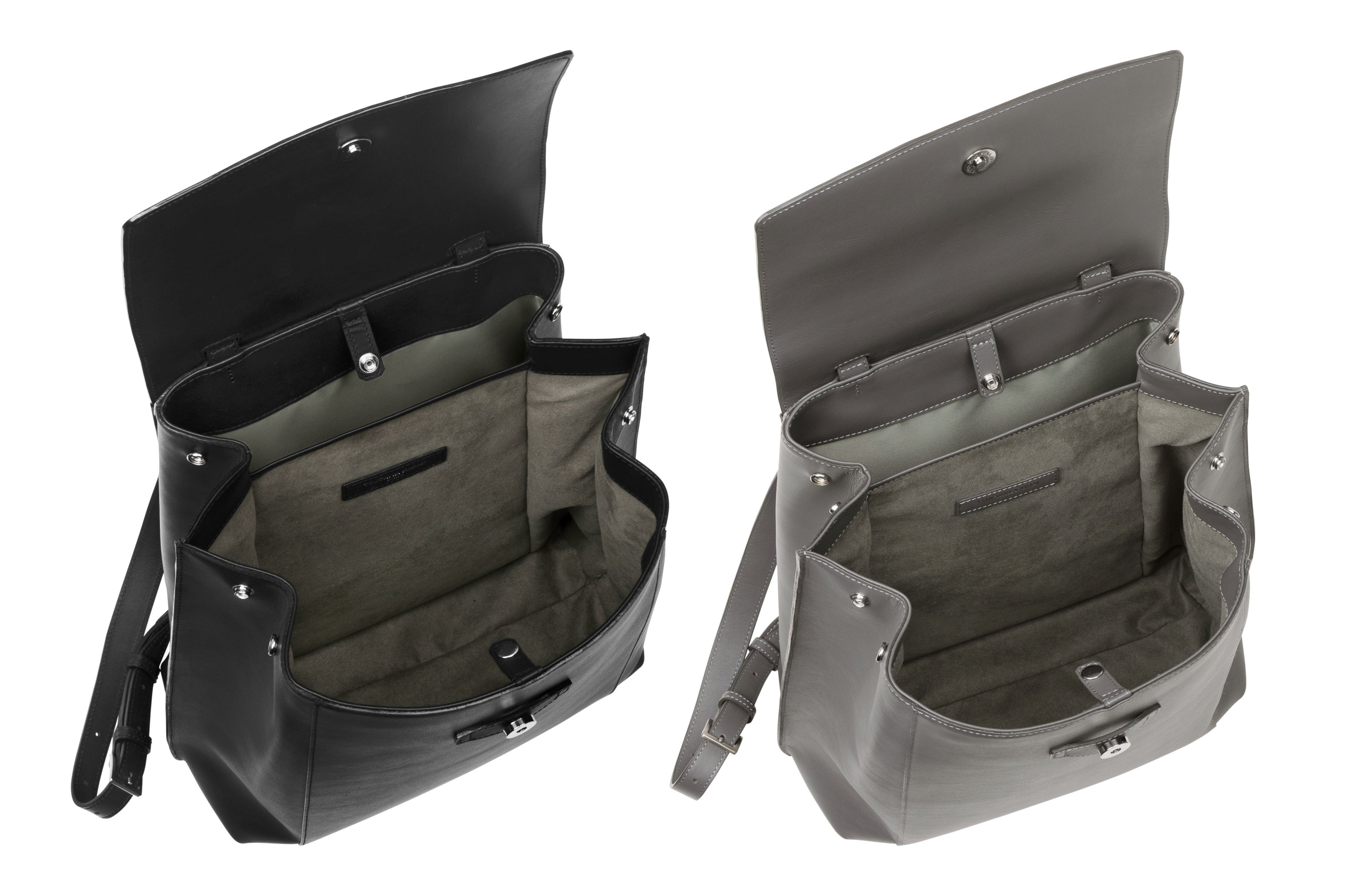 内装カラーは、「ブラック」「スチールグレー」のいずれもグレーを採用し、外装カラーと調和させながら、汚れが目立ちにくい配色としています。ステッチカラーは、「ブラック」には同色のブラック、「スチールグレー」にはグレーをそれぞれ採用。コバ部分も革と同色で統一することで、バックパック全体を品良く、美しい佇まいに仕上げています。