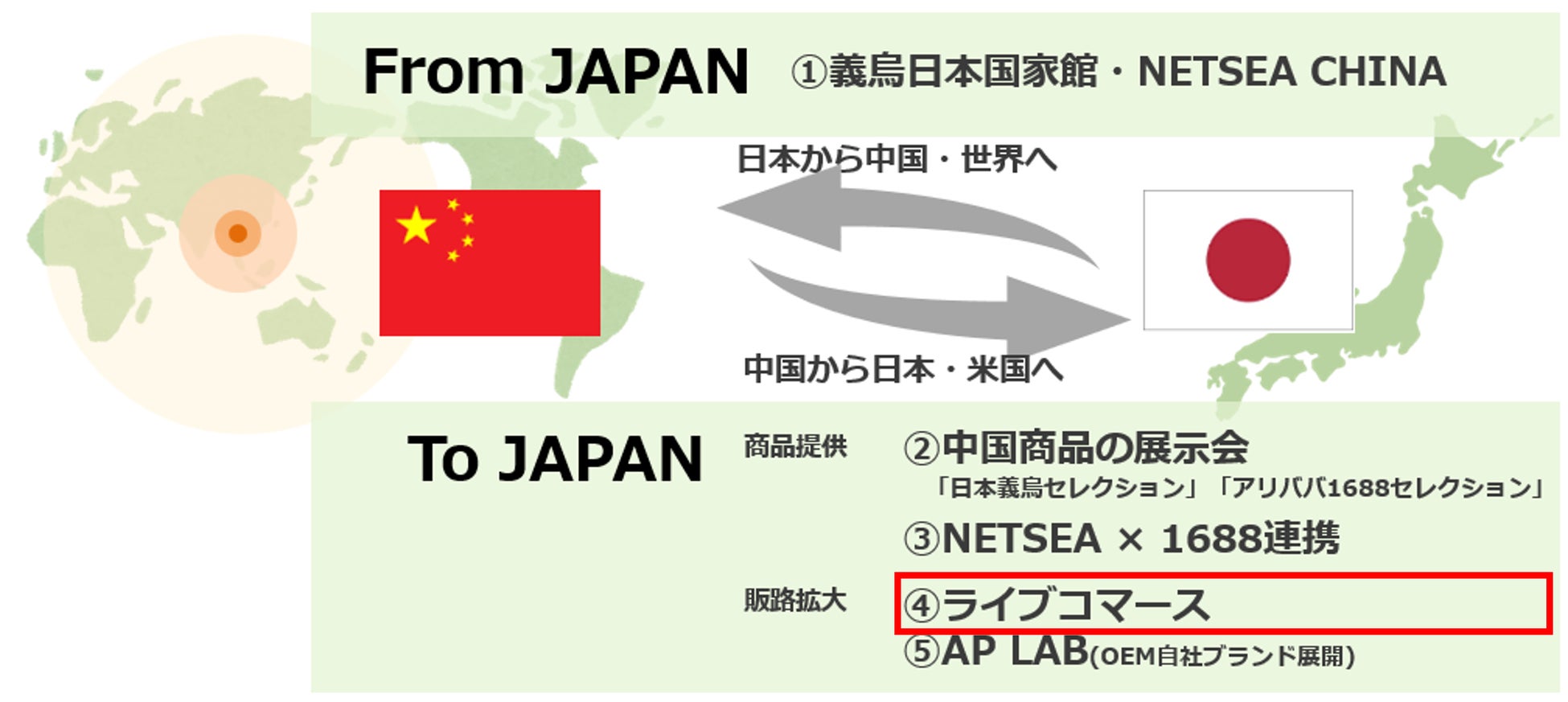特に、巨大なポテンシャルを持つ海外市場を重要な戦略エリアと位置づけ、グローバルな視点での事業展開を加速させています。中国をはじめとする商品供給力を強みに、ライブコマース事業にも取り組んでいます。