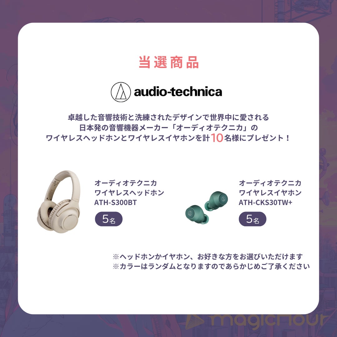 また “Alright” を良質な音でたくさんお聴きいただけるように。との思いから、オーディオテクニカのヘッドホン【ATH-S300BT】とイヤホン【ATH-CKS30TW+】のどちらかご希望の賞品をお選びいただけます。