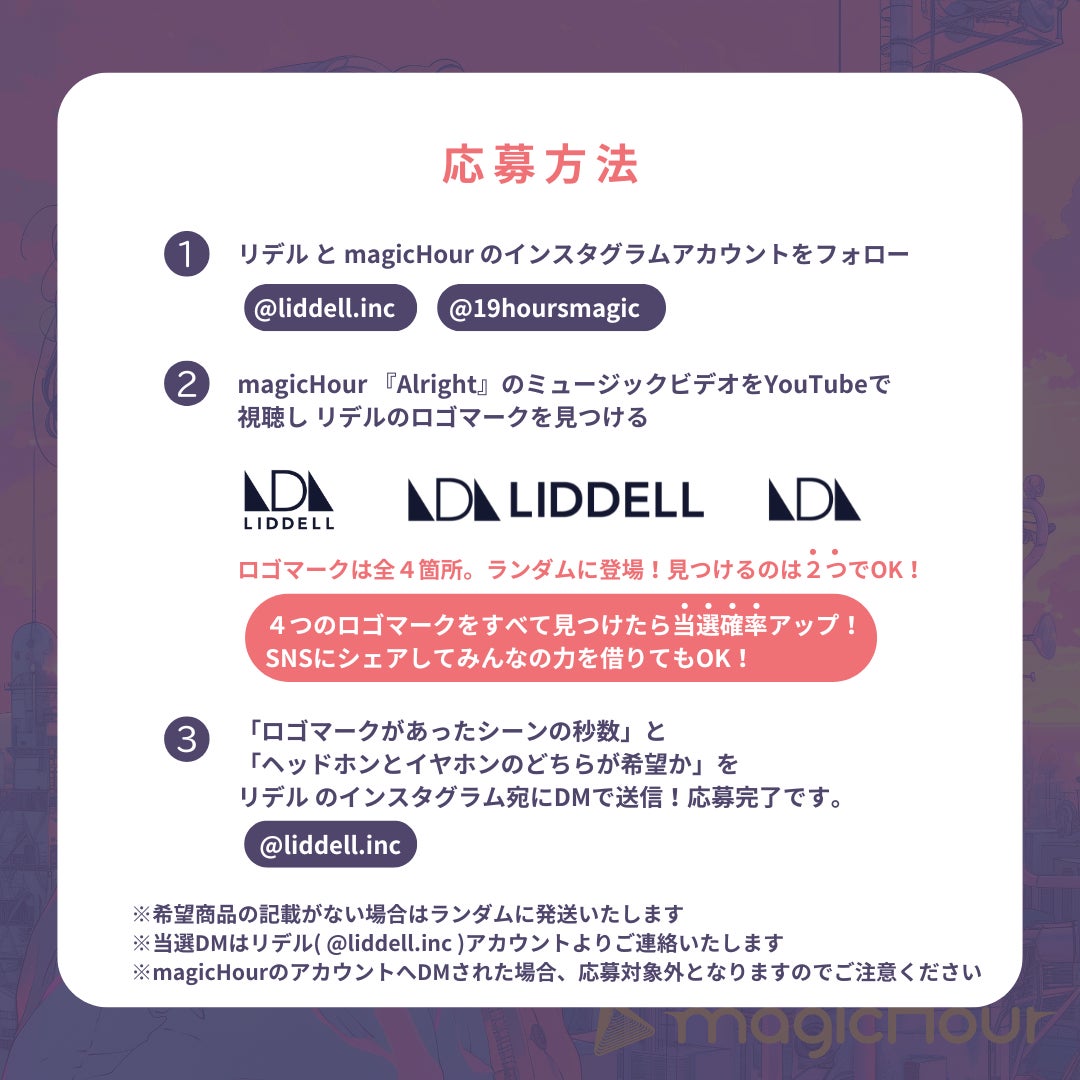 人を基軸としたマーケティング事業を展開するLIDDELL株式会社(本社:東京都港区、代表取締役:福田 晃一、以下リデル)は、リデル10周年を記念した「LIDDELL Inc.’s 10th Anniversary Celebration Song」としてアーティスト「magicHour」の5th Single “Alright” とタイアップしております。この度、“Alright” のリリース記念としてミュージックビデオ内に隠れた「リデルのロゴ」を見つけられた方の中から、抽選で 10名にオーディオテクニカのヘッドホンorイヤホンが当たるキャンペーンをリデル公式インスタグラムにて、10月11日(金)より開始いたしました。