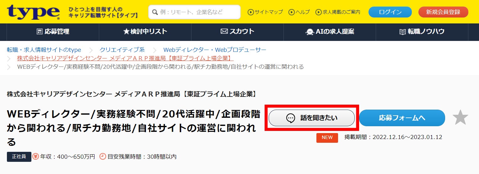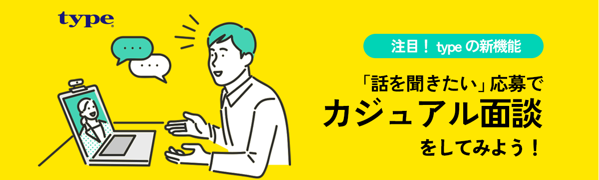近年IT・Web業界を中心にカジュアル面談(※1)が一般化。納得感やマッチング度を重視した転職活動が主流となる中で、『type』でも求職者と企業の接点を増やす方法の一つとして、カジュアル面談のリクエストができる「話を聞きたい」応募ボタン(※2)を新設しました。
