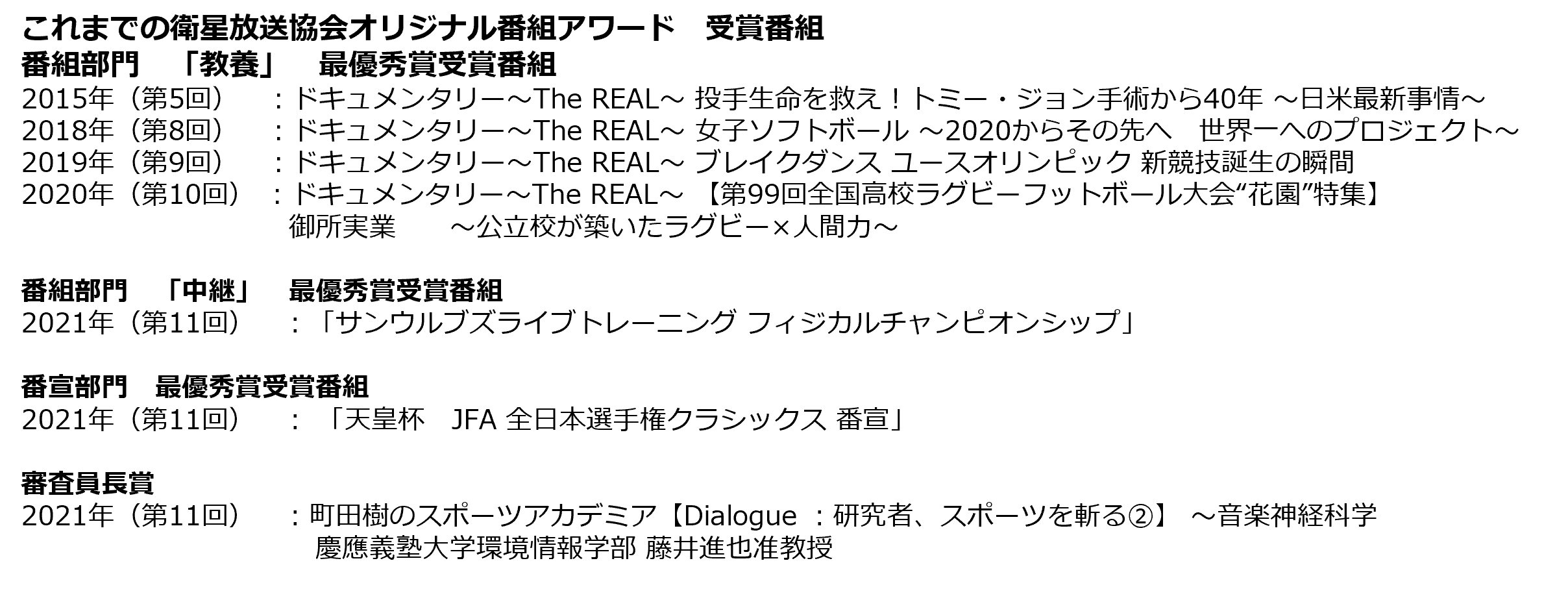 昨年の第11回衛星放送協会オリジナル番組アワードでは番組部門中継、番宣部門、審査員長賞で3作品が受賞しました。昨年は審査員長賞を「町田樹のスポーツアカデミア【Dialogue:研究者、スポーツを斬る②】 ~音楽神経科学~慶應義塾大学 環境情報学部 藤井進也准教授」が受賞し、同番組シリーズは2年連続の受賞となります。