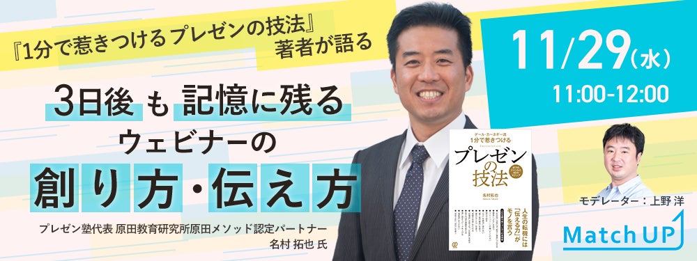 【11月29日(水)ウェブセミナー】『1分で惹きつける プレゼンの技法』著者が語る3日後も記憶に残るウェビナーの創り方・伝え方