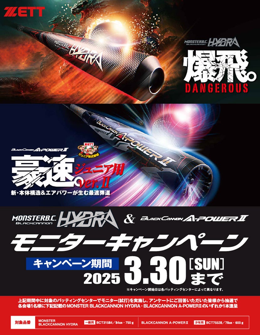「ベースボールを科学する。」ゼット株式会社(本社/大阪市天王寺区、代表取締役社長/渡辺裕之)は、高機能軟式バット2025年モデル【一般用 MONSTER BLACKCANNON HYDRA(モンスターブラックキャノンヒドラ)】と【小学生用 BLACKCANNON A-POWER Ⅱ(ブラックキャノンAパワー Ⅱ)】の発売にともない、モニターキャンペーンを全国20箇所のバッティングセンターで好評実施中です。